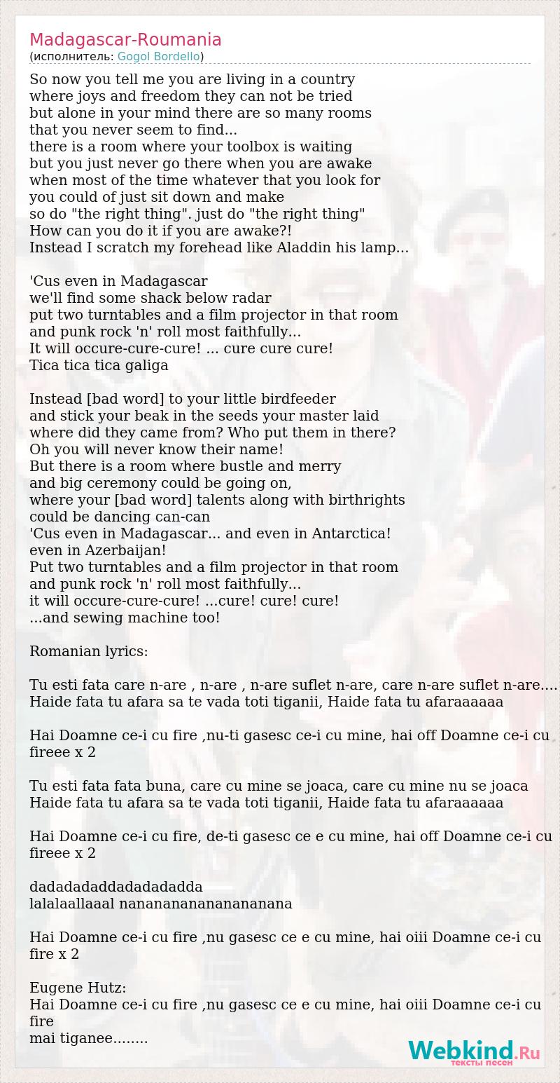 So now you tell me you are living in a country where joys and freedom they can not be tried but alone in your mind there are so many rooms that you never seem to find... there is a room where your toolbox is waiting but you just never go there when you are awake when most of the time whatever that you look for you could of just sit down and make so do "the right thing". just do "the right thing" How can you do it if you are awake?! Instead I scratch my forehead like Aladdin his lamp... 'Cus even in Madagascar we'll find some shack below radar put two turntables and a film projector in that room and punk rock 'n' roll most faithfully... It will occure-cure-cure! ... cure cure cure! Tica tica tica galiga Instead [bad word] to your little birdfeeder and stick your beak in the seeds your master laid where did they came from? Who put them in there? Oh you will never know their name! But there is a room where bustle and merry and big ceremony could be going on, where your [bad word] talents along with birthrights could be dancing can-can 'Cus even in Madagascar... and even in Antarctica! even in Azerbaijan! Put two turntables and a film projector in that room and punk rock 'n' roll most faithfully... it will occure-cure-cure! ...cure! cure! cure! ...and sewing machine too! Romanian lyrics: Tu esti fata care n-are , n-are , n-are suflet n-are, care n-are suflet n-are.... Haide fata tu afara sa te vada toti tiganii, Haide fata tu afaraaaaaa Hai Doamne ce-i cu fire ,nu-ti gasesc ce-i cu mine, hai off Doamne ce-i cu fireee x 2 Tu esti fata fata buna, care cu mine se joaca, care cu mine nu se joaca Haide fata tu afara sa te vada toti tiganii, Haide fata tu afaraaaaaa Hai Doamne ce-i cu fire, de-ti gasesc ce e cu mine, hai off Doamne ce-i cu fireee x 2 dadadadaddadadadadda lalalaallaaal nananananananananana Hai Doamne ce-i cu fire ,nu gasesc ce e cu mine, hai oiii Doamne ce-i cu fire x 2 Eugene Hutz: Hai Doamne ce-i cu fire ,nu gasesc ce e cu mine, hai oiii Doamne ce-i cu fire mai tiganee........