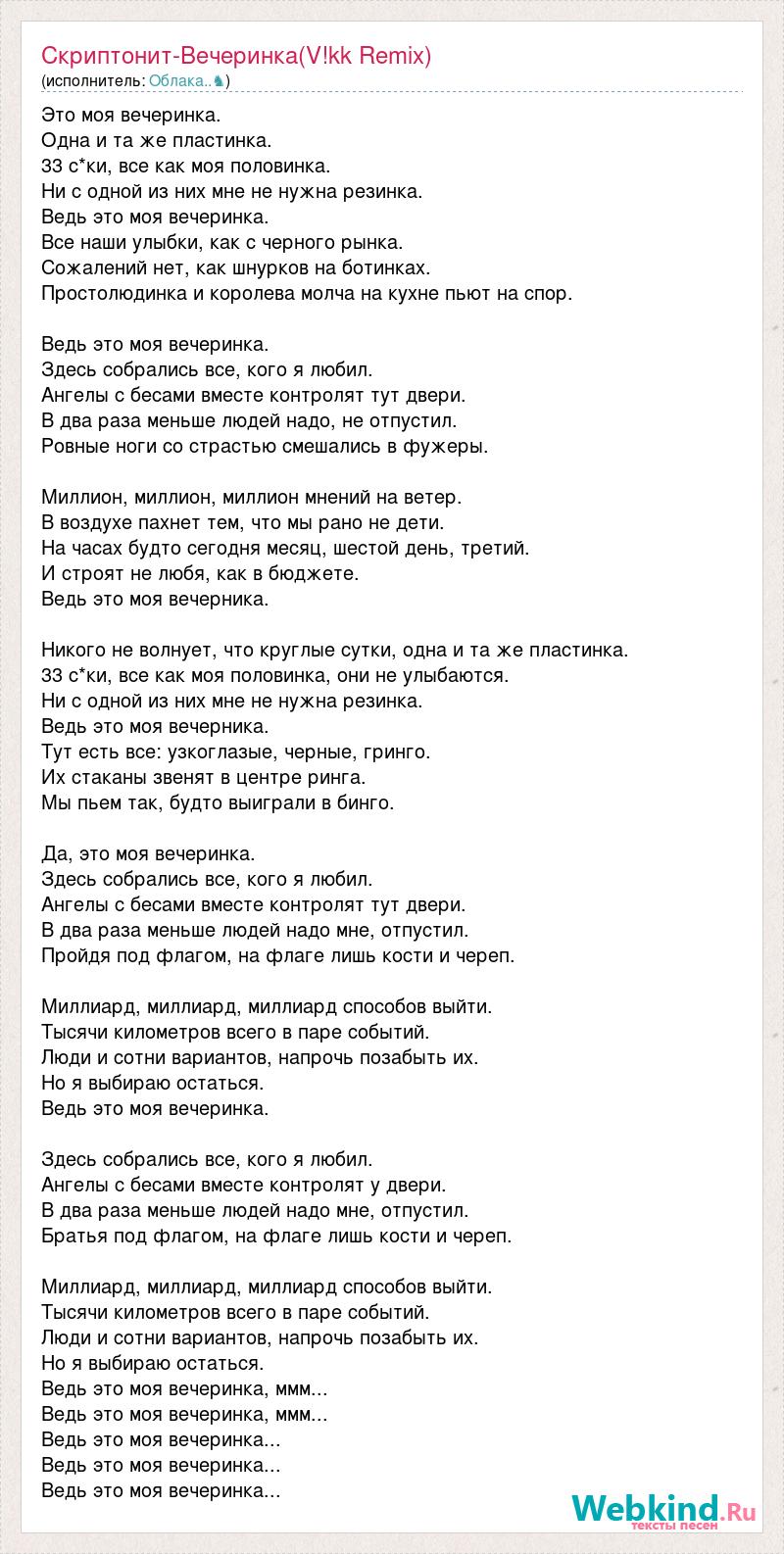 Это моя вечеринка. Одна и та же пластинка. 33 с*ки, все как моя половинка. Ни с одной из них мне не нужна резинка. Ведь это моя вечеринка. Все наши улыбки, как с черного рынка. Сожалений нет, как шнурков на ботинках. Простолюдинка и королева молча на кухне пьют на спор. Ведь это моя вечеринка. Здесь собрались все, кого я любил. Ангелы с бесами вместе контролят тут двери. В два раза меньше людей надо, не отпустил. Ровные ноги со страстью смешались в фужеры. Миллион, миллион, миллион мнений на ветер. В воздухе пахнет тем, что мы рано не дети. На часах будто сегодня месяц, шестой день, третий. И строят не любя, как в бюджете. Ведь это моя вечерника. Никого не волнует, что круглые сутки, одна и та же пластинка. 33 с*ки, все как моя половинка, они не улыбаются. Ни с одной из них мне не нужна резинка. Ведь это моя вечерника. Тут есть все: узкоглазые, черные, гринго. Их стаканы звенят в центре ринга. Мы пьем так, будто выиграли в бинго. Да, это моя вечеринка. Здесь собрались все, кого я любил. Ангелы с бесами вместе контролят тут двери. В два раза меньше людей надо мне, отпустил. Пройдя под флагом, на флаге лишь кости и череп. Миллиард, миллиард, миллиард способов выйти. Тысячи километров всего в паре событий. Люди и сотни вариантов, напрочь позабыть их. Но я выбираю остаться. Ведь это моя вечеринка. Здесь собрались все, кого я любил. Ангелы с бесами вместе контролят у двери. В два раза меньше людей надо мне, отпустил. Братья под флагом, на флаге лишь кости и череп. Миллиард, миллиард, миллиард способов выйти. Тысячи километров всего в паре событий. Люди и сотни вариантов, напрочь позабыть их. Но я выбираю остаться. Ведь это моя вечеринка, ммм... Ведь это моя вечеринка, ммм... Ведь это моя вечеринка... Ведь это моя вечеринка... Ведь это моя вечеринка...