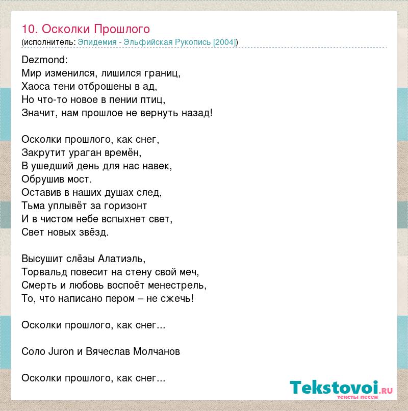 Dezmond: Мир изменился, лишился границ, Хаоса тени отброшены в ад, Но что-то новое в пении птиц, Значит, нам прошлое не вернуть назад! Осколки прошлого, как снег, Закрутит ураган времён, В ушедший день для нас навек, Обрушив мост. Оставив в наших душах след, Тьма уплывёт за горизонт И в чистом небе вспыхнет свет, Свет новых звёзд. Высушит слёзы Алатиэль, Торвальд повесит на стену свой меч, Смерть и любовь воспоёт менестрель, То, что написано пером – не сжечь! Осколки прошлого, как снег... Соло Juron и Вячеслав Молчанов Осколки прошлого, как снег...