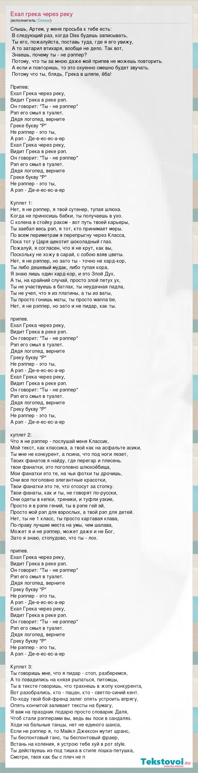 Слышь, Артем, у меня просьба к тебе есть: В следующий раз, когда Diss будешь записывать, Ты его, пожалуйста, поставь туда, где я его увижу, А то затарил втихаря, вообще не дело. Так вот, Знаешь, почему ты - не рэппер? Потому, что ты за мною даже мой припев не можешь повторить. А если и повторишь, то это охуенно смешно будет звучать. Потому что ты, блядь, Грека в шляпе, ёба! Припев: Ехал Грека через реку, Видит Грека в реке рэп. Он говорит: "Ты - не рэппер" Рэп его смыл в туалет. Дядя логопед, верните Греке букву "Р" Не рэппер - это ты, А рэп - Де-е-ес-ес-а-ер Ехал Грека через реку, Видит Грека в реке рэп. Он говорит: "Ты - не рэппер" Рэп его смыл в туалет. Дядя логопед, верните Греке букву "Р" Не рэппер - это ты, А рэп - Де-е-ес-ес-а-ер Куплет 1: Нет, я не рэппер, я твой сутенер, тупая шлюха. Когда не приносишь бабки, ты получаешь в ухо. С колена в стойку раком - вот путь твоей карьеры, Ты заебал весь рэп, я тот, кто принимает меры. По всем периметрам я перепрыгну через Класса, Пока тот у Царя щекотит шоколадный глаз. Пожалуй, я согласен, что я не крут, как вы, Поскольку не хожу в сарай, с собою взяв цветы. Нет, я не рэппер, но зато ты - точно не хард-кор, Ты либо дешевый мудак, либо тупая кора, Я знаю лишь один хард-кор, и это Злой Дух, А ты, на крайний случай, просто злой петух ух, Ты не участвуешь в батлах, ты неудачная падла, Ты не учел, что я из платины, а ты из ваты, Ты просто гонишь маты, ты просто wanna be, Нет, я не рэппер, но зато и не пидар, как ты. припев. Ехал Грека через реку, Видит Грека в реке рэп. Он говорит: "Ты - не рэппер" Рэп его смыл в туалет. Дядя логопед, верните Греку букву "Р" Не рэппер - это ты, А рэп - Де-е-ес-ес-а-ер Ехал Грека через реку, Видит Грека в реке рэп. Он говорит: "Ты - не рэппер" Рэп его смыл в туалет. Дядя логопед, верните Греку букву "Р" Не рэппер - это ты, А рэп - Де-е-ес-ес-а-ер куплет 2: Что я не рэппер - послушай меня Классик, Мой текст, как классика, а твой как на асфальте асики, Ты мне не конкурент, а псина, что под ноги лезет, Твоих фанатов я найду, где перегар и плесень. твои фанатки, это поголовно шлюхоёбища, Мои фанатки это те, на чьи фотки ты дрочишь, Они все поголовно элегантные красотки, Твои фанатки это те, что отсосут за стопку. Твои фанаты, как и ты, не говорят по-русски, Они одеты в кепки, треники, и туфли узкие, Просто я в рэпе гений, ты в рэпе гей эй, Просто мой рэп для взрослых, а твой рэп для детей. Нет, ты не 1 класс, ты просто картавая клава, По-праву лучшие места на умы, чем шалава, Может я и не рэппер, может даже и не Бог, Зато я знаю, стопудово, что ты - лох. припев. Ехал Грека через реку, Видит Грека в реке рэп. Он говорит: "Ты - не рэппер" Рэп его смыл в туалет. Дядя логопед, верните Греку букву "Р" Не рэппер - это ты, А рэп - Де-е-ес-ес-а-ер Ехал Грека через реку, Видит Грека в реке рэп. Он говорит: "Ты - не рэппер" Рэп его смыл в туалет. Дядя логопед, верните Греку букву "Р" Не рэппер - это ты, А рэп - Де-е-ес-ес-а-ер Куплет 3: Ты говоришь мне, что я пидар - стоп, разберемся, А то повадились на князя рыпаться, питомцы, Ты в тексте говоришь, что трахнешь в жопу конкурента, Вот разобрались, кто - пацан, кто - светло-синий кент. По-ходу твой бой-френд залег опять устроить впрягу, Опять кончитой заливает тексты на бумагу, Я вам на праздник подарю просто словарик Даля, Чтоб стали рэпперами вы, ведь вы лоси в сандалях. Ходи на бальные танцы, нет не единого шанса, Если не рэппер я, то Майкл Джексон мутит шранс, Ты беспонтовы