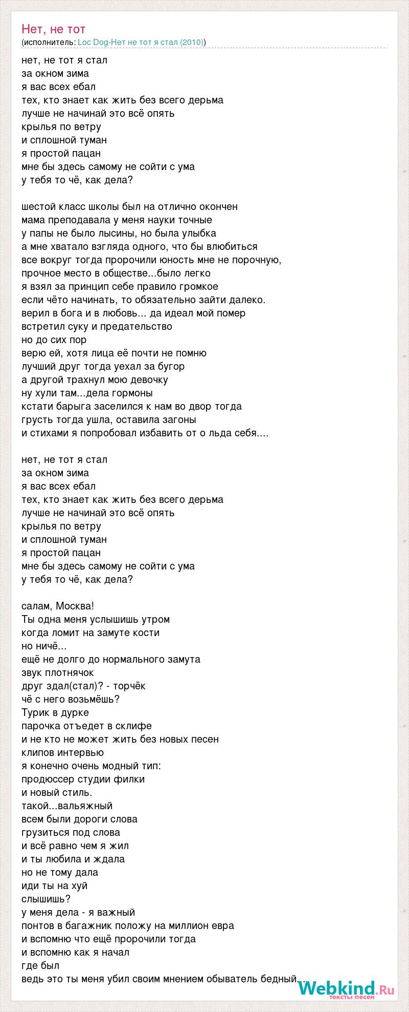нет, не тот я стал за окном зима я вас всех ебал тех, кто знает как жить без всего дерьма лучше не начинай это всё опять крылья по ветру и сплошной туман я простой пацан мне бы здесь самому не сойти с ума у тебя то чё, как дела? шестой класс школы был на отлично окончен мама преподавала у меня науки точные у папы не было лысины, но была улыбка а мне хватало взгляда одного, что бы влюбиться все вокруг тогда пророчили юность мне не порочную, прочное место в обществе...было легко я взял за принцип себе правило громкое если чёто начинать, то обязательно зайти далеко. верил в бога и в любовь... да идеал мой помер встретил суку и предательство но до сих пор верю ей, хотя лица её почти не помню лучший друг тогда уехал за бугор а другой трахнул мою девочку ну хули там...дела гормоны кстати барыга заселился к нам во двор тогда грусть тогда ушла, оставила загоны и стихами я попробовал избавить от о льда себя.... нет, не тот я стал за окном зима я вас всех ебал тех, кто знает как жить без всего дерьма лучше не начинай это всё опять крылья по ветру и сплошной туман я простой пацан мне бы здесь самому не сойти с ума у тебя то чё, как дела? салам, Москва! Ты одна меня услышишь утром когда ломит на замуте кости но ничё... ещё не долго до нормального замута звук плотнячок друг здал(стал)? - торчёк чё с него возьмёшь? Турик в дурке парочка отъедет в склифе и не кто не может жить без новых песен клипов интервью я конечно очень модный тип: продюссер студии филки и новый стиль. такой...вальяжный всем были дороги слова грузиться под слова и всё равно чем я жил и ты любила и ждала но не тому дала иди ты на хуй слышишь? у меня дела - я важный понтов в багажник положу на миллион евра и вспомню что ещё пророчили тогда и вспомню как я начал где был ведь это ты меня убил своим мнением обыватель бедный...
