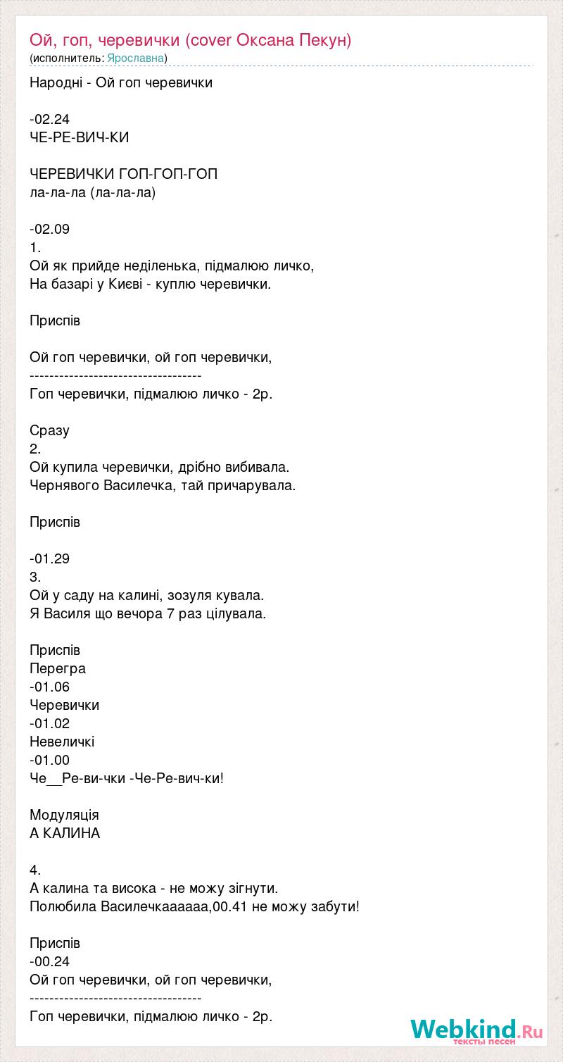 Народнi - Ой гоп черевички -02.24 ЧЕ-РЕ-ВИЧ-КИ ЧЕРЕВИЧКИ ГОП-ГОП-ГОП ла-ла-ла (ла-ла-ла) -02.09 1. Ой як прийде неділенька, підмалюю личко, На базарі у Києві - куплю черевички. Приспiв Ой гоп черевички, ой гоп черевички, ----------------------------------- Гоп черевички, підмалюю личко - 2р. Сразу 2. Ой купила черевички, дрібно вибивала. Чернявого Василечка, тай причарувала. Приспiв -01.29 3. Ой у саду на калині, зозуля кувала. Я Василя що вечора 7 раз цілувала. Приспiв Перегра -01.06 Черевички -01.02 Невеличкi -01.00 Че__Ре-ви-чки -Че-Ре-вич-ки! Модуляцiя А КАЛИНА 4. А калина та висока - не можу зігнути. Полюбила Василечкаааааа,00.41 не можу забути! Приспiв -00.24 Ой гоп черевички, ой гоп черевички, ----------------------------------- Гоп черевички, підмалюю личко - 2р.