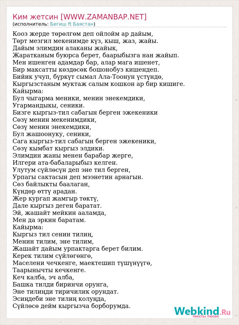 Кооз жерде төрөлгөм деп ойлойм ар дайым, Төрт мезгил мекенимде күз, кыш, жаз, жайы. Дайым элимдин алаканы жайык, Жаратканым буюрса берет, баарыбызга нан жайып. Мен ишенген адамдар бар, алар мага ишенет, Бир максатты көздөсөк бошонобуз кишендеп. Бийик учуп, бүркүт сымал Ала-Тоонун үстүндө, Кыргызстаным муктаж салым кошкон ар бир кишиге. Кайырма: Бул чыгарма меники, менин энекемдики, Угармандыкы, сеники. Бизге кыргыз-тил сабагын берген эжекеники Сөзү менин мекенимдики, Сөзү менин энекемдики, Бул жашоонуку, сеники, Сага кыргыз-тил сабагын берген эжекеники, Сөзү кымбат кыргыз элдики. Элимдин жаны менен барабар жерге, Илгери ата-бабаларыбыз келген. Улутум сүйлөсүн деп эне тил берген, Урпагы сактасын деп мээнетин арнагын. Сөз байлыкты баалаган, Күндөр өттү арадан. Жер кургап жамгыр төктү, Дале кыргыз деген баратат. Эй, жашайт мейкин ааламда, Мен да эркин баратам. Кайырма: Кыргыз тил сенин тилиң, Менин тилим, эне тилим, Жашайт дайым урпактарга берет билим. Керек тилим сүйлөгөнгө, Маселени чечкенге, маектешип түшүнүүгө, Таарынычты кечкенге. Кеч калба, эч алба, Башка тилди биринчи орунга, Эне тилиңди тиричилик орундат. Эсиңдеби эне тилиң колуңда, Сүйлөсө дейм кыргызча борборумда.