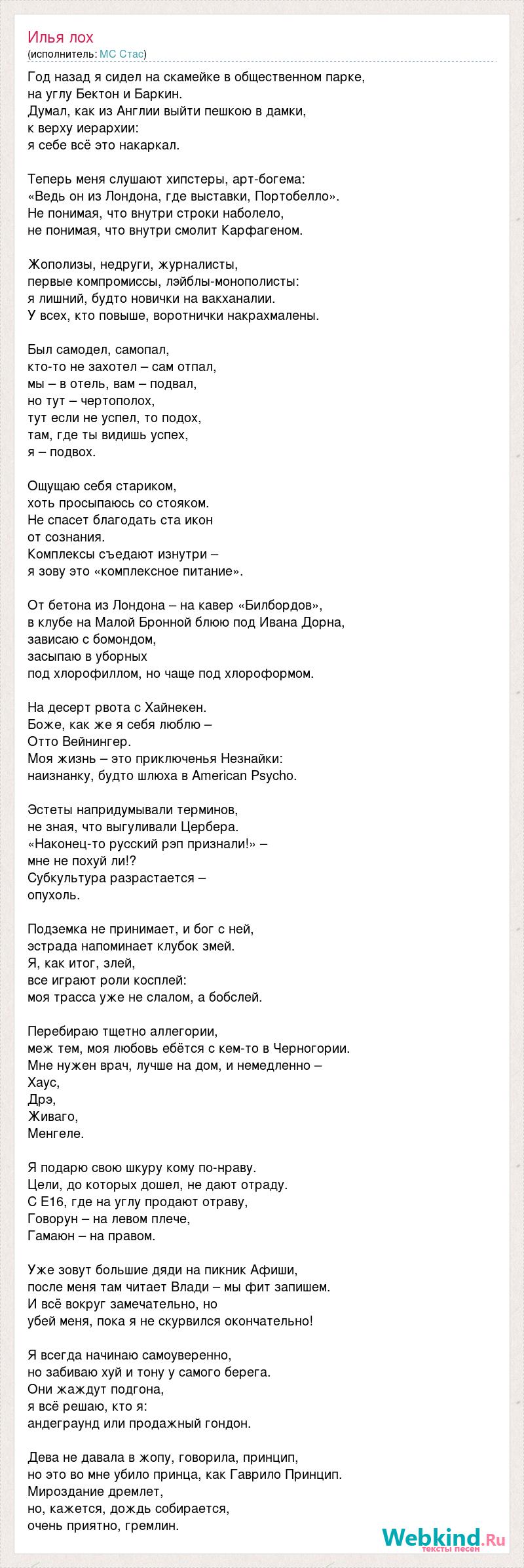 Год назад я сидел на скамейке в общественном парке, на углу Бектон и Баркин. Думал, как из Англии выйти пешкою в дамки, к верху иерархии: я себе всё это накаркал. Теперь меня слушают хипстеры, арт-богема: «Ведь он из Лондона, где выставки, Портобелло». Не понимая, что внутри строки наболело, не понимая, что внутри смолит Карфагеном. Жополизы, недруги, журналисты, первые компромиссы, лэйблы-монополисты: я лишний, будто новички на вакханалии. У всех, кто повыше, воротнички накрахмалены. Был самодел, самопал, кто-то не захотел – сам отпал, мы – в отель, вам – подвал, но тут – чертополох, тут если не успел, то подох, там, где ты видишь успех, я – подвох. Ощущаю себя стариком, хоть просыпаюсь со стояком. Не спасет благодать ста икон от сознания. Комплексы съедают изнутри – я зову это «комплексное питание». От бетона из Лондона – на кавер «Билбордов», в клубе на Малой Бронной блюю под Ивана Дорна, зависаю с бомондом, засыпаю в уборных под хлорофиллом, но чаще под хлороформом. На десерт рвота с Хайнекен. Боже, как же я себя люблю – Отто Вейнингер. Моя жизнь – это приключенья Незнайки: наизнанку, будто шлюха в American Psycho. Эстеты напридумывали терминов, не зная, что выгуливали Цербера. «Наконец-то русский рэп признали!» – мне не похуй ли!? Субкультура разрастается – опухоль. Подземка не принимает, и бог с ней, эстрада напоминает клубок змей. Я, как итог, злей, все играют роли косплей: моя трасса уже не слалом, а бобслей. Перебираю тщетно аллегории, меж тем, моя любовь ебётся с кем-то в Черногории. Мне нужен врач, лучше на дом, и немедленно – Хаус, Дрэ, Живаго, Менгеле. Я подарю свою шкуру кому по-нраву. Цели, до которых дошел, не дают отраду. С Е16, где на углу продают отраву, Говорун – на левом плече, Гамаюн – на правом. Уже зовут большие дяди на пикник Афиши, после меня там читает Влади – мы фит запишем. И всё вокруг замечательно, но убей меня, пока я не скурвился окончательно! Я всегда начинаю самоуверенно, но забиваю хуй и тону у самого берега. Они жаждут подгона, я всё решаю, кто я: андеграунд или продажный гондон. Дева не давала в жопу, говорила, принцип, но это во мне убило принца, как Гаврило Принцип. Мироздание дремлет, но, кажется, дождь собирается, очень приятно, гремлин.