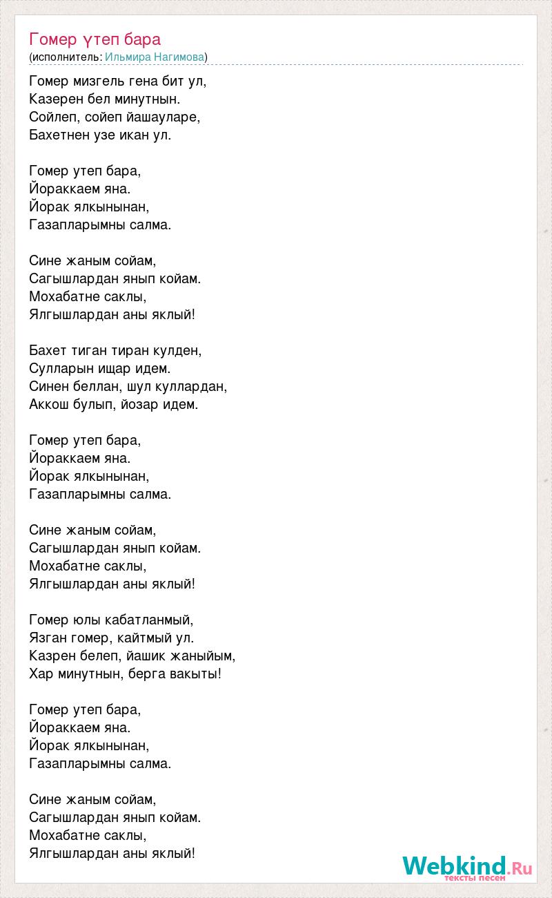 Гомер мизгель гена бит ул, Казерен бел минутнын. Сойлеп, сойеп йашауларе, Бахетнен узе икан ул. Гомер утеп бара, Йораккаем яна. Йорак ялкынынан, Газапларымны салма. Сине жаным сойам, Сагышлардан янып койам. Мохабатне саклы, Ялгышлардан аны яклый! Бахет тиган тиран кулден, Сулларын ищар идем. Синен беллан, шул куллардан, Аккош булып, йозар идем. Гомер утеп бара, Йораккаем яна. Йорак ялкынынан, Газапларымны салма. Сине жаным сойам, Сагышлардан янып койам. Мохабатне саклы, Ялгышлардан аны яклый! Гомер юлы кабатланмый, Язган гомер, кайтмый ул. Казрен белеп, йашик жаныйым, Хар минутнын, берга вакыты! Гомер утеп бара, Йораккаем яна. Йорак ялкынынан, Газапларымны салма. Сине жаным сойам, Сагышлардан янып койам. Мохабатне саклы, Ялгышлардан аны яклый!