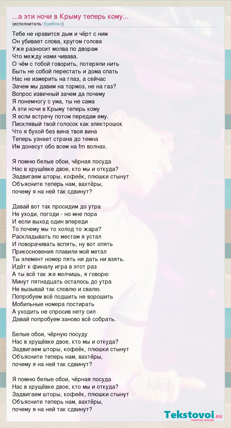 Тебе не нравится дым и чёрт с ним Он убивает слова, кругом голова Уже разносит молва по дворам Что между нами чивава. О чём с тобой говорить, потеряли нить Быть не собой перестать и дома спать Нас не измерить на глаз, а сейчас Зачем мы давим на тормоз, не на газ? Вопрос извечный зачем да почему Я понемногу с ума, ты не сама А эти ночи в Крыму теперь кому Я если встречу потом передам ему. Писклявый твой голосок как электрошок Что я бухой без вина твоя вина Теперь узнает страна до темна Им донесут обо всем на fm волнах. Я помню белые обои, чёрная посуда Нас в хрущёвке двое, кто мы и откуда? Задвигаем шторы, кофеёк, плюшки стынут Объясните теперь нам, вахтёры, почему я на ней так сдвинут? Давай вот так просидим до утра Не уходи, погоди - но мне пора И если выход один впереди То почему мы то холод то жара? Раскладывать по местам я устал И поворачивать вспять, ну вот опять Прикосновения плавили мой метал Ты элемент номер пять ни дать ни взять. Идёт к финалу игра в этот раз А ты всё так же молчишь, я говорю Минут пятнадцать осталось до утра Не вызывай так словлю и свалю. Попробуем всё подшить не ворошить Мобильные номера постирать А уходить не спросив нету сил Давай попробуем заново всё собрать. Белые обои, чёрную посуду Нас в хрущёвке двое, кто мы и откуда? Задвигаем шторы, кофеёк, плюшки стынут Объясните теперь нам, вахтёры, почему я на ней так сдвинут? Я помню белые обои, чёрная посуда Нас в хрущёвке двое, кто мы и откуда? Задвигаем шторы, кофеёк, плюшки стынут Объясните теперь нам, вахтёры, почему я на ней так сдвинут?