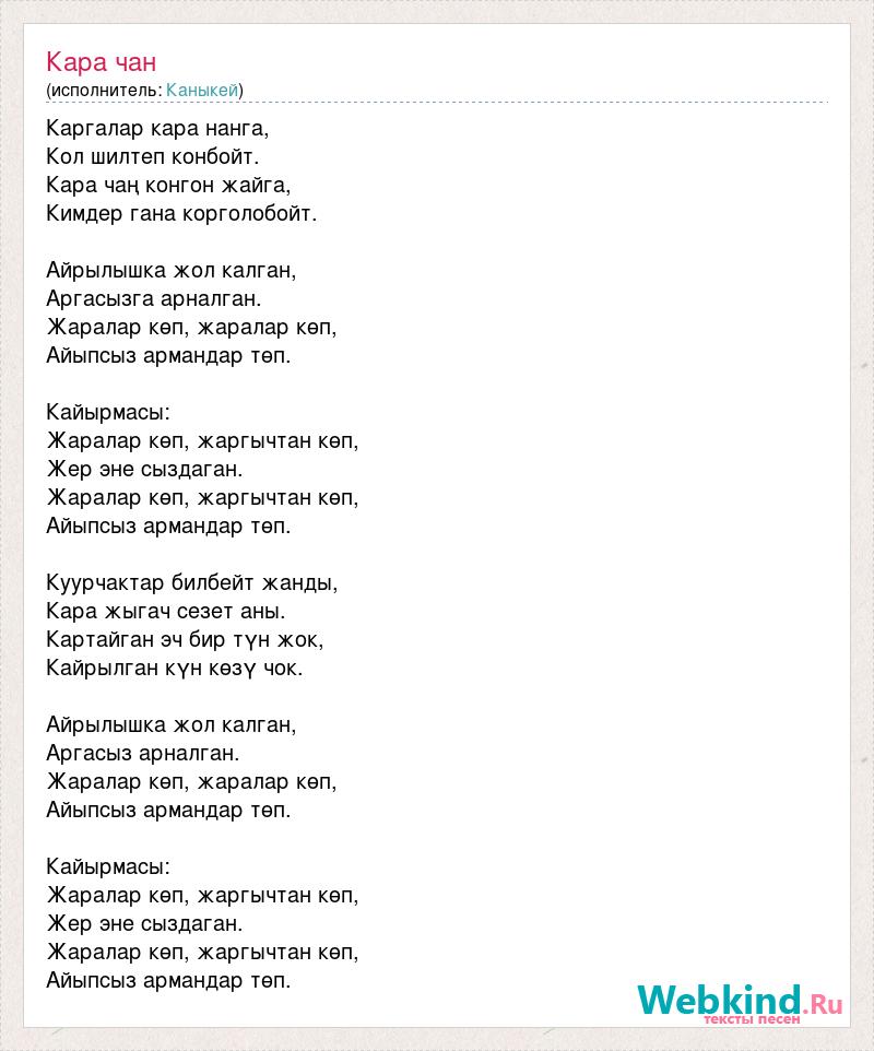 Каргалар кара нанга, Кол шилтеп конбойт. Кара чаң конгон жайга, Кимдер гана корголобойт. Айрылышка жол калган, Аргасызга арналган. Жаралар көп, жаралар көп, Айыпсыз армандар төп. Кайырмасы: Жаралар көп, жаргычтан көп, Жер эне сыздаган. Жаралар көп, жаргычтан көп, Айыпсыз армандар төп. Куурчактар билбейт жанды, Кара жыгач сезет аны. Картайган эч бир түн жок, Кайрылган күн көзү чок. Айрылышка жол калган, Аргасыз арналган. Жаралар көп, жаралар көп, Айыпсыз армандар төп. Кайырмасы: Жаралар көп, жаргычтан көп, Жер эне сыздаган. Жаралар көп, жаргычтан көп, Айыпсыз армандар төп.