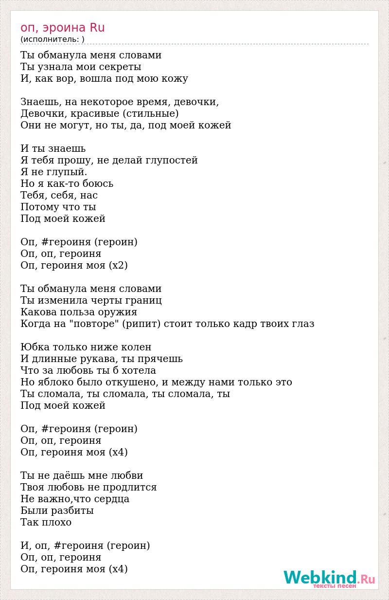 Ты обманула меня словами Ты узнала мои секреты И, как вор, вошла под мою кожу Знаешь, на некоторое время, девочки, Девочки, красивые (стильные) Они не могут, но ты, да, под моей кожей И ты знаешь Я тебя прошу, не делай глупостей Я не глупый. Но я как-то боюсь Тебя, себя, нас Потому что ты Под моей кожей Оп, #героиня (героин) Оп, оп, героиня Оп, героиня моя (х2) Ты обманула меня словами Ты изменила черты границ Какова польза оружия Когда на "повторе" (рипит) стоит только кадр твоих глаз Юбка только ниже колен И длинные рукава, ты прячешь Что за любовь ты б хотела Но яблоко было откушено, и между нами только это Ты сломала, ты сломала, ты сломала, ты Под моей кожей Оп, #героиня (героин) Оп, оп, героиня Оп, героиня моя (х4) Ты не даёшь мне любви Твоя любовь не продлится Не важно,что сердца Были разбиты Так плохо И, оп, #героиня (героин) Оп, оп, героиня Оп, героиня моя (х4)