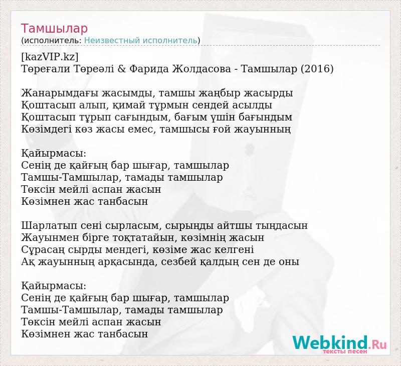 [kazVIP.kz] Төреғали Төреәлі & Фарида Жолдасова - Тамшылар (2016) Жанарымдағы жасымды, тамшы жаңбыр жасырды Қоштасып алып, қимай тұрмын сендей асылды Қоштасып тұрып сағындым, бағым үшін бағындым Көзімдегі көз жасы емес, тамшысы ғой жауынның Қайырмасы: Сенің де қайғың бар шығар, тамшылар Тамшы-Тамшылар, тамады тамшылар Төксін мейлі аспан жасын Көзімнен жас танбасын Шарлатып сені сырласым, сырыңды айтшы тыңдасын Жауынмен бірге тоқтатайын, көзімнің жасын Сұрасаң сырды мендегі, көзіме жас келгені Ақ жауынның арқасында, сезбей қалдың сен де оны Қайырмасы: Сенің де қайғың бар шығар, тамшылар Тамшы-Тамшылар, тамады тамшылар Төксін мейлі аспан жасын Көзімнен жас танбасын