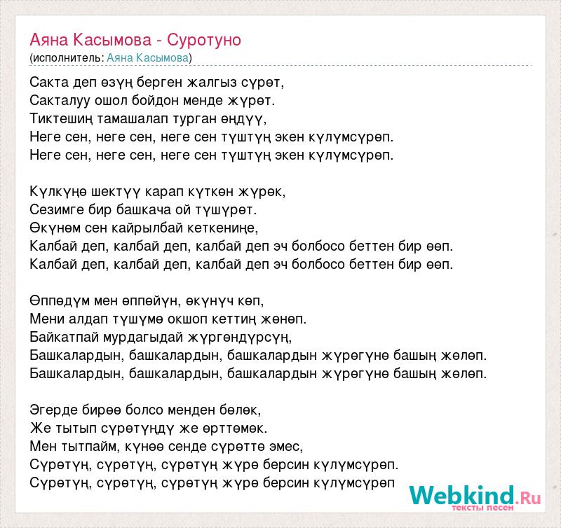 Сакта деп өзүң берген жалгыз сүрөт, Сакталуу ошол бойдон менде жүрөт. Тиктешиң тамашалап турган өңдүү, Неге сен, неге сен, неге сен түштүң экен күлүмсүрөп. Неге сен, неге сен, неге сен түштүң экен күлүмсүрөп. Күлкүңө шектүү карап күткөн жүрөк, Сезимге бир башкача ой түшүрөт. Өкүнөм сен кайрылбай кеткениңе, Калбай деп, калбай деп, калбай деп эч болбосо беттен бир өөп. Калбай деп, калбай деп, калбай деп эч болбосо беттен бир өөп. Өппөдүм мен өппөйүн, өкүнүч көп, Мени алдап түшүмө окшоп кеттиң жөнөп. Байкатпай мурдагыдай жүргөндүрсүң, Башкалардын, башкалардын, башкалардын жүрөгүнө башың жөлөп. Башкалардын, башкалардын, башкалардын жүрөгүнө башың жөлөп. Эгерде бирөө болсо менден бөлөк, Же тытып сүрөтүңдү же өрттөмөк. Мен тытпайм, күнөө сенде сүрөттө эмес, Сүрөтүң, сүрөтүң, сүрөтүң жүрө берсин күлүмсүрөп. Сүрөтүң, сүрөтүң, сүрөтүң жүрө берсин күлүмсүрөп