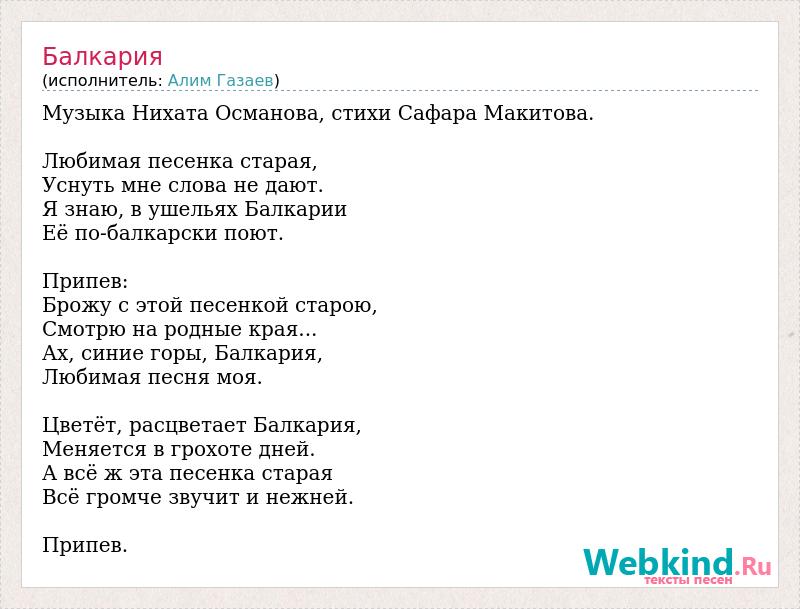 Музыка Нихата Османова, стихи Сафара Макитова. Любимая песенка старая, Уснуть мне слова не дают. Я знаю, в ушельях Балкарии Её по-балкарски поют. Припев: Брожу с этой песенкой старою, Смотрю на родные края... Ах, синие горы, Балкария, Любимая песня моя. Цветёт, расцветает Балкария, Меняется в грохоте дней. А всё ж эта песенка старая Всё громче звучит и нежней. Припев.
