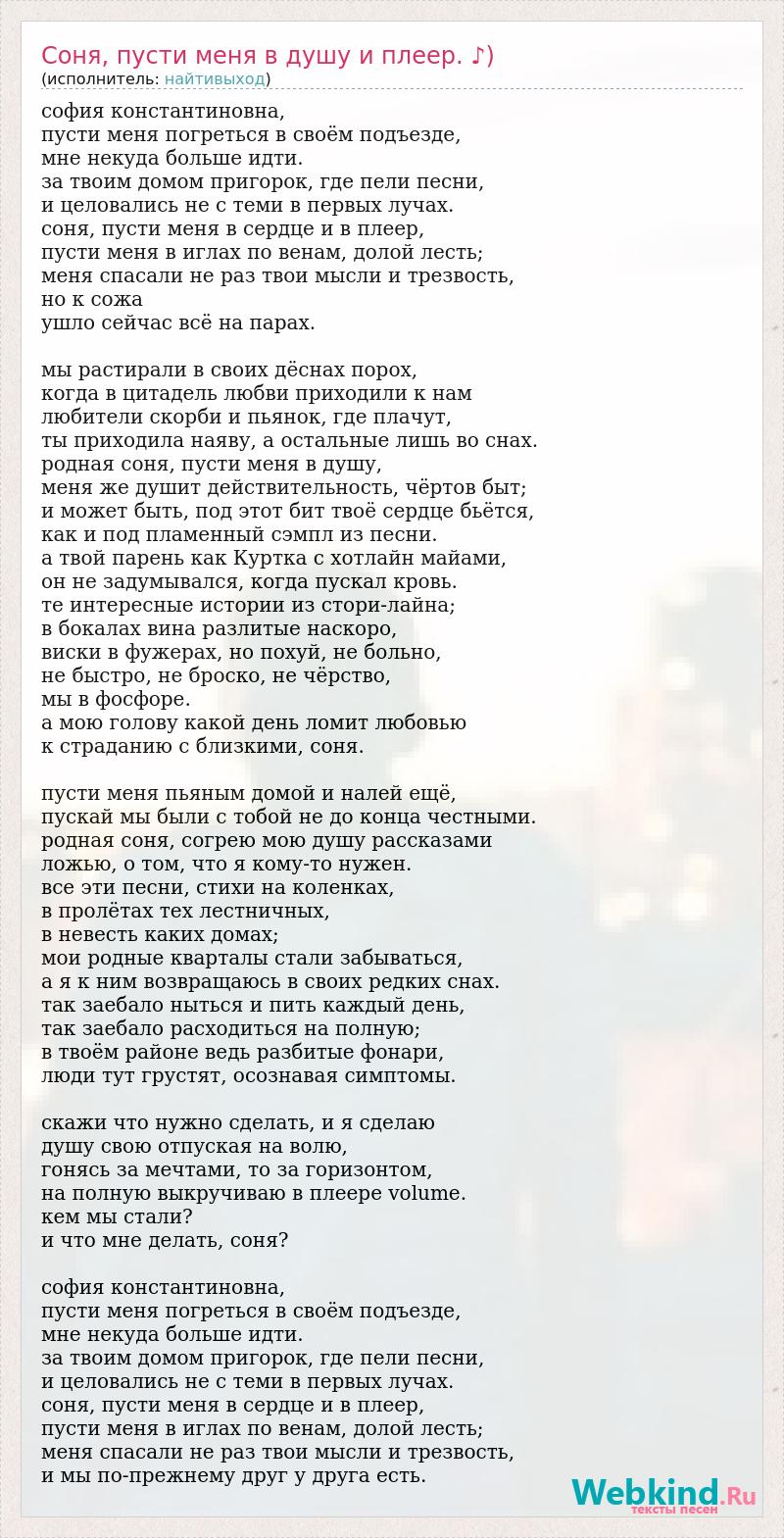 софия константиновна, пусти меня погреться в своём подъезде, мне некуда больше идти. за твоим домом пригорок, где пели песни, и целовались не с теми в первых лучах. соня, пусти меня в сердце и в плеер, пусти меня в иглах по венам, долой лесть; меня спасали не раз твои мысли и трезвость, но к сожа ушло сейчас всё на парах. мы растирали в своих дёснах порох, когда в цитадель любви приходили к нам любители скорби и пьянок, где плачут, ты приходила наяву, а остальные лишь во снах. родная соня, пусти меня в душу, меня же душит действительность, чёртов быт; и может быть, под этот бит твоё сердце бьётся, как и под пламенный сэмпл из песни. а твой парень как Куртка с хотлайн майами, он не задумывался, когда пускал кровь. те интересные истории из стори-лайна; в бокалах вина разлитые наскоро, виски в фужерах, но похуй, не больно, не быстро, не броско, не чёрство, мы в фосфоре. а мою голову какой день ломит любовью к страданию с близкими, соня. пусти меня пьяным домой и налей ещё, пускай мы были с тобой не до конца честными. родная соня, согрею мою душу рассказами ложью, о том, что я кому-то нужен. все эти песни, стихи на коленках, в пролётах тех лестничных, в невесть каких домах; мои родные кварталы стали забываться, а я к ним возвращаюсь в своих редких снах. так заебало ныться и пить каждый день, так заебало расходиться на полную; в твоём районе ведь разбитые фонари, люди тут грустят, осознавая симптомы. скажи что нужно сделать, и я сделаю душу свою отпуская на волю, гонясь за мечтами, то за горизонтом, на полную выкручиваю в плеере volume. кем мы стали? и что мне делать, соня? софия константиновна, пусти меня погреться в своём подъезде, мне некуда больше идти. за твоим домом пригорок, где пели песни, и целовались не с теми в первых лучах. соня, пусти меня в сердце и в плеер, пусти меня в иглах по венам, долой лесть; меня спасали не раз твои мысли и трезвость, и мы по-прежнему друг у друга есть.