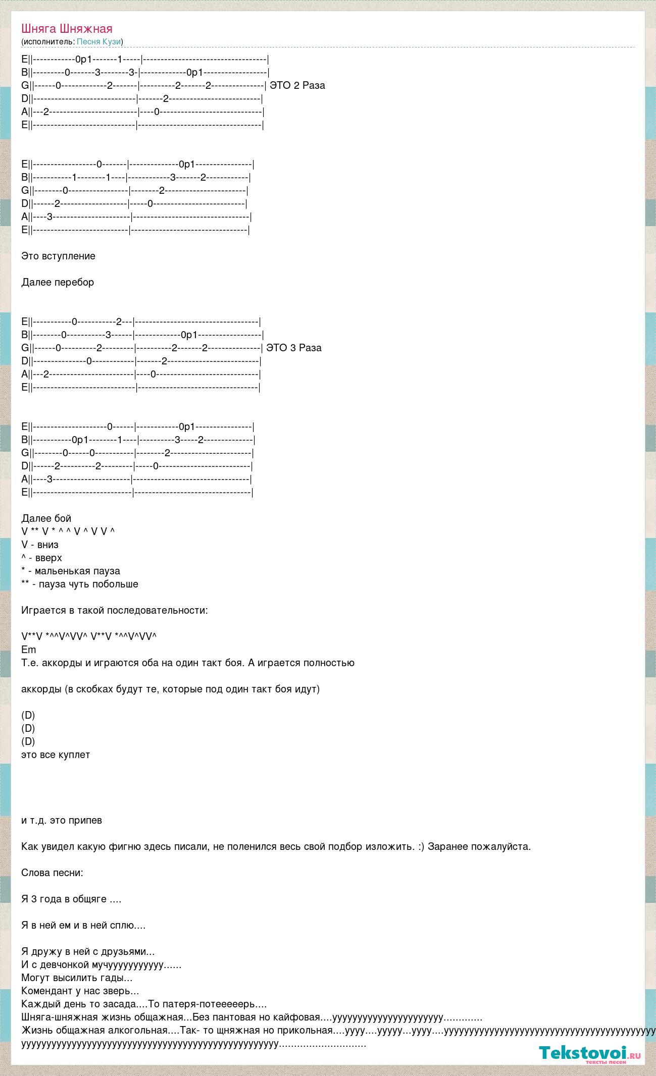 E||------------0р1-------1-----|-----------------------------------| B||---------0-------3--------3-|-------------0р1------------------| G||------0-------------2-------|----------2-------2---------------| ЭТО 2 Раза D||-----------------------------|-------2--------------------------| A||---2-------------------------|----0-----------------------------| E||-----------------------------|-----------------------------------| E||------------------0-------|--------------0p1----------------| B||-----------1--------1----|------------3-------2------------| G||--------0-----------------|--------2-----------------------| D||------2-------------------|-----0--------------------------| A||----3----------------------|---------------------------------| E||---------------------------|---------------------------------| Это вступление Далее перебор E||-----------0-----------2---|-----------------------------------| B||--------0-----------3------|-------------0р1------------------| G||------0----------2---------|----------2-------2---------------| ЭТО 3 Раза D||---------------0------------|-------2--------------------------| A||---2------------------------|----0-----------------------------| E||-----------------------------|----------------------------------| E||---------------------0------|------------0p1----------------| B||-----------0р1--------1----|----------3-----2--------------| G||--------0------0-----------|--------2-----------------------| D||------2----------2---------|-----0--------------------------| A||----3----------------------|---------------------------------| E||----------------------------|---------------------------------| Далее бой V ** V * ^ ^ V ^ V V ^ V - вниз ^ - вверх * - мальенькая пауза ** - пауза чуть побольше Играется в такой последовательности: V**V *^^V^VV^ V**V *^^V^VV^ Еm Т.е. аккорды и играются оба на один такт боя. А играется полностью аккорды (в скобках будут те, которые под один такт боя идут) (D) (D) (D) это все куплет и т.д. это припев Как увидел какую фигню здесь писали, не поленился весь свой подбор изложить. :) Заранее пожалуйста. Слова песни: Я 3 года в общяге .... Я в ней ем и в ней сплю.... Я дружу в ней с друзьями... И с девчонкой мучууууууууууу...... Могут высилить гады... Комендант у нас зверь... Каждый день то засада....То патеря-потееееерь.... Шняга-шняжная жизнь общажная...Без пантовая но кайфовая....уууууууууууууууууууууу............. Жизнь общажная алкогольная....Так- то щняжная но прикольная....уууу....ууууу...уууу....уууууууууууууууууууууууууууууууууууууууууу ууууууууууууууууууууууууууууууууууууууууууууууууууу.............................