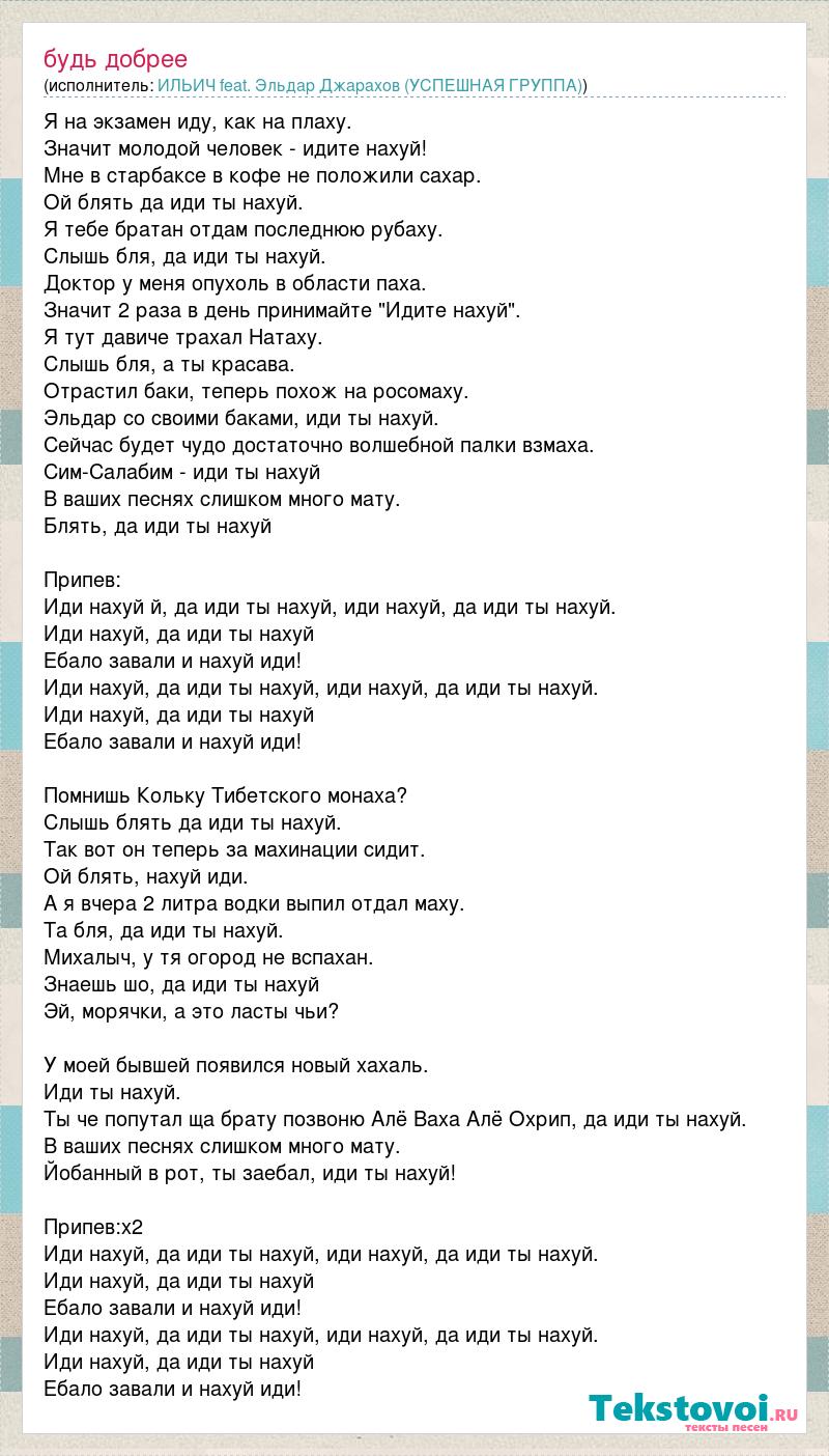 Я на экзамен иду, как на плаху. Значит молодой человек - идите нахуй! Мне в старбаксе в кофе не положили сахар. Ой блять да иди ты нахуй. Я тебе братан отдам последнюю рубаху. Слышь бля, да иди ты нахуй. Доктор у меня опухоль в области паха. Значит 2 раза в день принимайте "Идите нахуй". Я тут давиче трахал Натаху. Слышь бля, а ты красава. Отрастил баки, теперь похож на росомаху. Эльдар со своими баками, иди ты нахуй. Сейчас будет чудо достаточно волшебной палки взмаха. Сим-Салабим - иди ты нахуй В ваших песнях слишком много мату. Блять, да иди ты нахуй Припев: Иди нахуй й, да иди ты нахуй, иди нахуй, да иди ты нахуй. Иди нахуй, да иди ты нахуй Ебало завали и нахуй иди! Иди нахуй, да иди ты нахуй, иди нахуй, да иди ты нахуй. Иди нахуй, да иди ты нахуй Ебало завали и нахуй иди! Помнишь Кольку Тибетского монаха? Слышь блять да иди ты нахуй. Так вот он теперь за махинации сидит. Ой блять, нахуй иди. А я вчера 2 литра водки выпил отдал маху. Та бля, да иди ты нахуй. Михалыч, у тя огород не вспахан. Знаешь шо, да иди ты нахуй Эй, морячки, а это ласты чьи? У моей бывшей появился новый хахаль. Иди ты нахуй. Ты че попутал ща брату позвоню Алё Ваха Алё Охрип, да иди ты нахуй. В ваших песнях слишком много мату. Йобанный в рот, ты заебал, иди ты нахуй! Припев:х2 Иди нахуй, да иди ты нахуй, иди нахуй, да иди ты нахуй. Иди нахуй, да иди ты нахуй Ебало завали и нахуй иди! Иди нахуй, да иди ты нахуй, иди нахуй, да иди ты нахуй. Иди нахуй, да иди ты нахуй Ебало завали и нахуй иди!