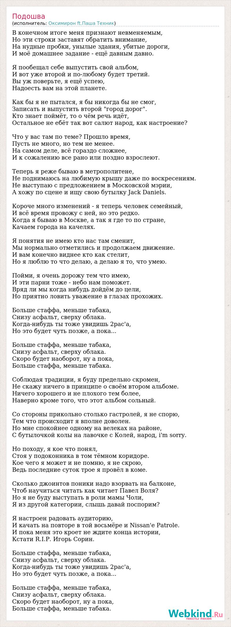 В конечном итоге меня признают невменяемым, Но эти строки заставят обратить внимание, На нудные пробки, унылые здания, убитые дороги, И моё домашнее задание - ещё давным давно. Я пообещал себе выпустить свой альбом, И вот уже второй и по-любому будет третий. Вы уж поверьте, я ещё успею, Надоесть вам на этой планете. Как бы я не пытался, я бы никогда бы не смог, Записать и выпустить второй "город дорог". Кто знает поймёт, то о чём речь идёт, Остальное не ебёт так вот салют народ, как настроение? Что у вас там по теме? Прошло время, Пусть не много, но тем не менее. На самом деле, всё гораздо сложнее, И к сожалению все рано или поздно взрослеют. Теперь я реже бываю в метрополитене, Не поднимаюсь на любимую крышу даже по воскресениям. Не выступаю с предложением в Московской мэрии, А хожу по сцене и ищу свою бутылку Jack Daniels. Короче много изменений - я теперь человек семейный, И всё время провожу с ней, но это редко. Когда я бываю в Москве, а так я где то по стране, Качаем города на качелях. Я понятия не имею кто нас там сменит, Мы нормально отметились и продолжаем движение. И вам конечно виднее кто как стелит, Но я люблю то что делаю, а делаю я то, что умею. Пойми, я очень дорожу тем что имею, И эти парни тоже - небо нам поможет. Вряд ли мы когда нибудь дойдём до цели, Но приятно ловить уважение в глазах прохожих. Больше стаффа, меньше табака, Снизу асфальт, сверху облака. Когда-нибудь ты тоже увидишь 2pac'а, Но это будет чуть позже, а пока... Больше стаффа, меньше табака, Снизу асфальт, сверху облака. Скоро будет наоборот, ну а пока, Больше стаффа, меньше табака. Соблюдая традиции, я буду предельно скромен, Не скажу ничего в принципе о своём втором альбоме. Ничего хорошего и не плохого тем более, Наверно кроме того, что этот альбом сольный. Со стороны прикольно столько гастролей, я не спорю, Тем что происходит я вполне доволен. Но мне спокойнее одному на велеках на районе, С бутылочкой колы на лавочке с Колей, народ, i'm sorry. Но походу, я кое что понял, Стоя у подоконника в том тёмном коридоре. Кое чего я может и не помню, я не скрою, Ведь последние суток трое я провёл в коме. Сколько джоинтов поники надо взорвать на балконе, Чтоб научиться читать как читает Павел Воля? Но я не буду выступать в роли мамы Чоли, Я из другой категории, слышь давай поспорим? Я настроен радовать аудиторию, И качать на повторе в той восьмёре и Nissan'е Patrole. И пока меня это кроет не ждите конца истории, Кстати R.I.P. Игорь Сорин. Больше стаффа, меньше табака, Снизу асфальт, сверху облака. Когда-нибудь ты тоже увидишь 2pac'а, Но это будет чуть позже, а пока... Больше стаффа, меньше табака, Снизу асфальт, сверху облака. Скоро будет наоборот, ну а пока, Больше стаффа, меньше табака.