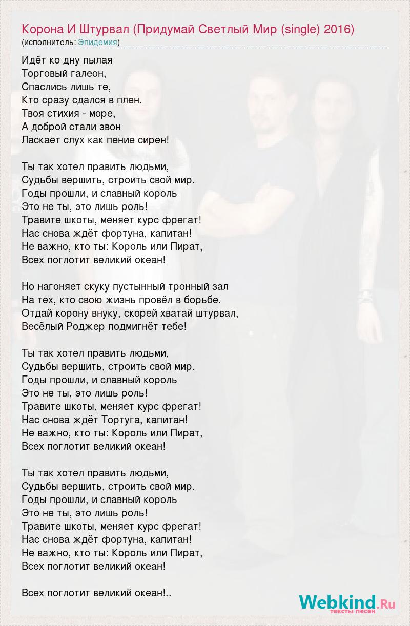 Идёт ко дну пылая Торговый галеон, Спаслись лишь те, Кто сразу сдался в плен. Твоя стихия - море, А доброй стали звон Ласкает слух как пение сирен! Ты так хотел править людьми, Судьбы вершить, строить свой мир. Годы прошли, и славный король Это не ты, это лишь роль! Травите шкоты, меняет курс фрегат! Нас снова ждёт фортуна, капитан! Не важно, кто ты: Король или Пират, Всех поглотит великий океан! Но нагоняет скуку пустынный тронный зал На тех, кто свою жизнь провёл в борьбе. Отдай корону внуку, скорей хватай штурвал, Весёлый Роджер подмигнёт тебе! Ты так хотел править людьми, Судьбы вершить, строить свой мир. Годы прошли, и славный король Это не ты, это лишь роль! Травите шкоты, меняет курс фрегат! Нас снова ждёт Тортуга, капитан! Не важно, кто ты: Король или Пират, Всех поглотит великий океан! Ты так хотел править людьми, Судьбы вершить, строить свой мир. Годы прошли, и славный король Это не ты, это лишь роль! Травите шкоты, меняет курс фрегат! Нас снова ждёт фортуна, капитан! Не важно, кто ты: Король или Пират, Всех поглотит великий океан! Всех поглотит великий океан!..