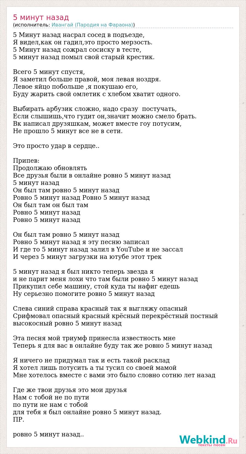 5 Минут назад насрал сосед в подъезде, Я видел,как он гадил,это просто мерзость. 5 Минут назад сожрал сосиску в тесте, 5 минут назад помыл свой старый крестик. Всего 5 минут спустя, Я заметил больше правой, моя левая ноздря. Левое яйцо побольше ,я покушаю его, Буду жарить свой омлетик с хлебом хватит одного. Выбирать арбузик сложно, надо сразу постучать, Если слышишь,что гудит он,значит можно смело брать. Вк написал друзяшкам, может вместе гоу потусим, Не прошло 5 минут все не в сети. Это просто удар в сердце.. Припев: Продолжаю обновлять Все друзья были в онлайне ровно 5 минут назад 5 минут назад Он был там ровно 5 минут назад Ровно 5 минут назад Ровно 5 минут назад Он был там он был там Ровно 5 минут назад Ровно 5 минут назад Он был там ровно 5 минут назад Ровно 5 минут назад я эту песню записал И где то 5 минут назад залил в YouTube и не зассал И через 5 минут загрузки на ютубе этот трек 5 минут назад я был никто теперь звезда я и не парит меня лохи что там были ровно 5 минут назад Прикупил себе машину, стой куда ты нафиг едешь Ну серьезно помогите ровно 5 минут назад Слева синий справа красный так я выгляжу опасный Срифмовал опасный красный крёсный перекрёстный постный высокосный ровно 5 минут назад Эта песня мой триумф принесла известность мне Теперь я для вас в онлайне буду так же ровно 5 минут назад Я ничего не придумал так и есть такой расклад Я хотел лишь потусить а ты тусил со своей мамой Мне хотелось вместе с вами это было словно сотню лет назад Где же твои друзья это мои друзья Нам с тобой не по пути по пути не нам с тобой для тебя я был онлайне ровно 5 минут назад. ПР. ровно 5 минут назад..