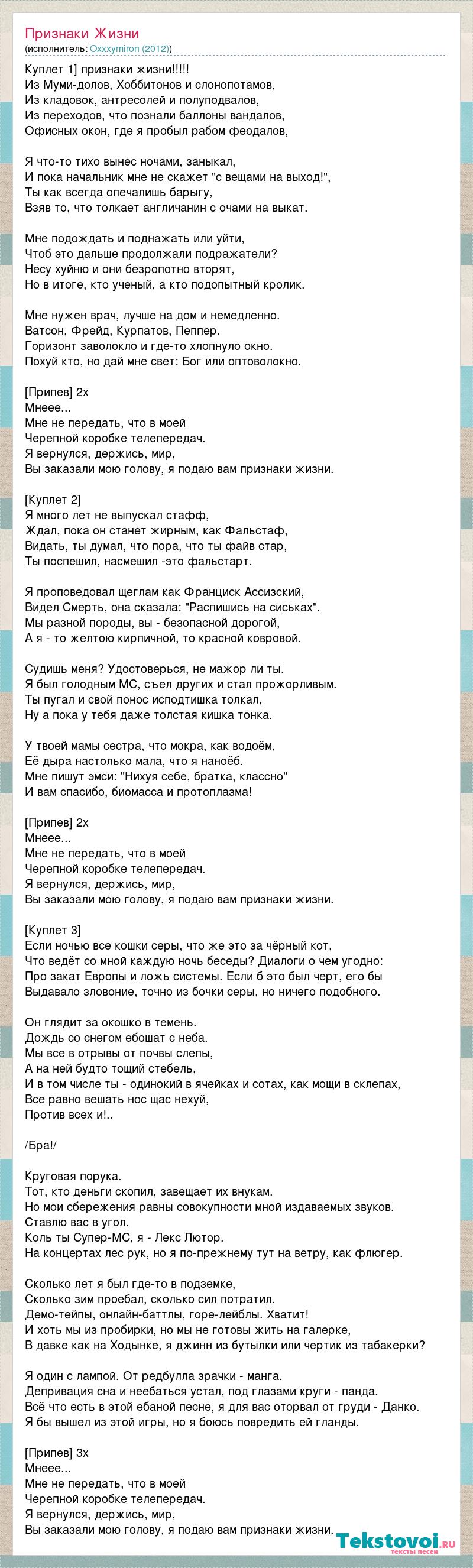 Куплет 1] признаки жизни!!!!! Из Муми-долов, Хоббитонов и слонопотамов, Из кладовок, антресолей и полуподвалов, Из переходов, что познали баллоны вандалов, Офисных окон, где я пробыл рабом феодалов, Я что-то тихо вынес ночами, заныкал, И пока начальник мне не скажет "с вещами на выход!", Ты как всегда опечалишь барыгу, Взяв то, что толкает англичанин с очами на выкат. Мне подождать и поднажать или уйти, Чтоб это дальше продолжали подражатели? Несу хуйню и они безропотно вторят, Но в итоге, кто ученый, а кто подопытный кролик. Мне нужен врач, лучше на дом и немедленно. Ватсон, Фрейд, Курпатов, Пеппер. Горизонт заволокло и где-то хлопнуло окно. Похуй кто, но дай мне свет: Бог или оптоволокно. [Припев] 2х Мнеее... Мне не передать, что в моей Черепной коробке телепередач. Я вернулся, держись, мир, Вы заказали мою голову, я подаю вам признаки жизни. [Куплет 2] Я много лет не выпускал стафф, Ждал, пока он станет жирным, как Фальстаф, Видать, ты думал, что пора, что ты файв стар, Ты поспешил, насмешил -это фальстарт. Я проповедовал щеглам как Франциск Ассизский, Видел Смерть, она сказала: "Распишись на сиськах". Мы разной породы, вы - безопасной дорогой, А я - то желтою кирпичной, то красной ковровой. Судишь меня? Удостоверься, не мажор ли ты. Я был голодным МС, съел других и стал прожорливым. Ты пугал и свой понос исподтишка толкал, Ну а пока у тебя даже толстая кишка тонка. У твоей мамы сестра, что мокра, как водоём, Её дыра настолько мала, что я наноёб. Мне пишут эмси: "Нихуя себе, братка, классно" И вам спасибо, биомасса и протоплазма! [Припев] 2х Мнеее... Мне не передать, что в моей Черепной коробке телепередач. Я вернулся, держись, мир, Вы заказали мою голову, я подаю вам признаки жизни. [Куплет 3] Если ночью все кошки серы, что же это за чёрный кот, Что ведёт со мной каждую ночь беседы? Диалоги о чем угодно: Про закат Европы и ложь системы. Если б это был черт, его бы Выдавало зловоние, точно из бочки серы, но ничего подобного. Он глядит за окошко в темень. Дождь со снегом ебошат с неба. Мы все в отрывы от почвы слепы, А на ней будто тощий стебель, И в том числе ты - одинокий в ячейках и сотах, как мощи в склепах, Все равно вешать нос щас нехуй, Против всех и!.. /Бра!/ Круговая порука. Тот, кто деньги скопил, завещает их внукам. Но мои сбережения равны совокупности мной издаваемых звуков. Ставлю вас в угол. Коль ты Супер-МС, я - Лекс Лютор. На концертах лес рук, но я по-прежнему тут на ветру, как флюгер. Сколько лет я был где-то в подземке, Сколько зим проебал, сколько сил потратил. Демо-тейпы, онлайн-баттлы, горе-лейблы. Хватит! И хоть мы из пробирки, но мы не готовы жить на галерке, В давке как на Ходынке, я джинн из бутылки или чертик из табакерки? Я один с лампой. От редбулла зрачки - манга. Депривация сна и неебаться устал, под глазами круги - панда. Всё что есть в этой ебаной песне, я для вас оторвал от груди - Данко. Я бы вышел из этой игры, но я боюсь повредить ей гланды. [Припев] 3х Мнеее... Мне не передать, что в моей Черепной коробке телепередач. Я вернулся, держись, мир, Вы заказали мою голову, я подаю вам признаки жизни.