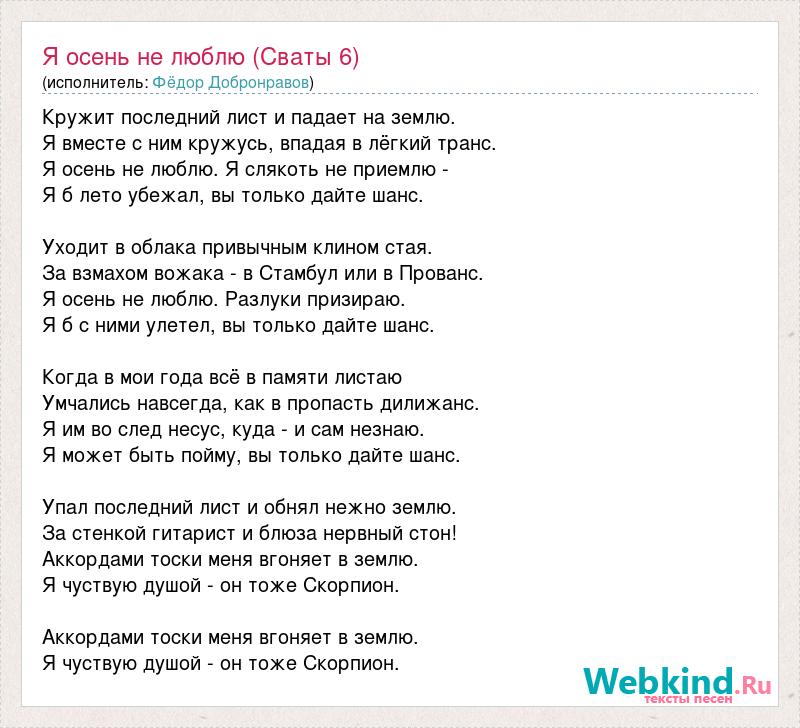 Кружит последний лист и падает на землю. Я вместе с ним кружусь, впадая в лёгкий транс. Я осень не люблю. Я слякоть не приемлю - Я б лето убежал, вы только дайте шанс. Уходит в облака привычным клином стая. За взмахом вожака - в Стамбул или в Прованс. Я осень не люблю. Разлуки призираю. Я б с ними улетел, вы только дайте шанс. Когда в мои года всё в памяти листаю Умчались навсегда, как в пропасть дилижанс. Я им во след несус, куда - и сам незнаю. Я может быть пойму, вы только дайте шанс. Упал последний лист и обнял нежно землю. За стенкой гитарист и блюза нервный стон! Аккордами тоски меня вгоняет в землю. Я чуствую душой - он тоже Скорпион. Аккордами тоски меня вгоняет в землю. Я чуствую душой - он тоже Скорпион.