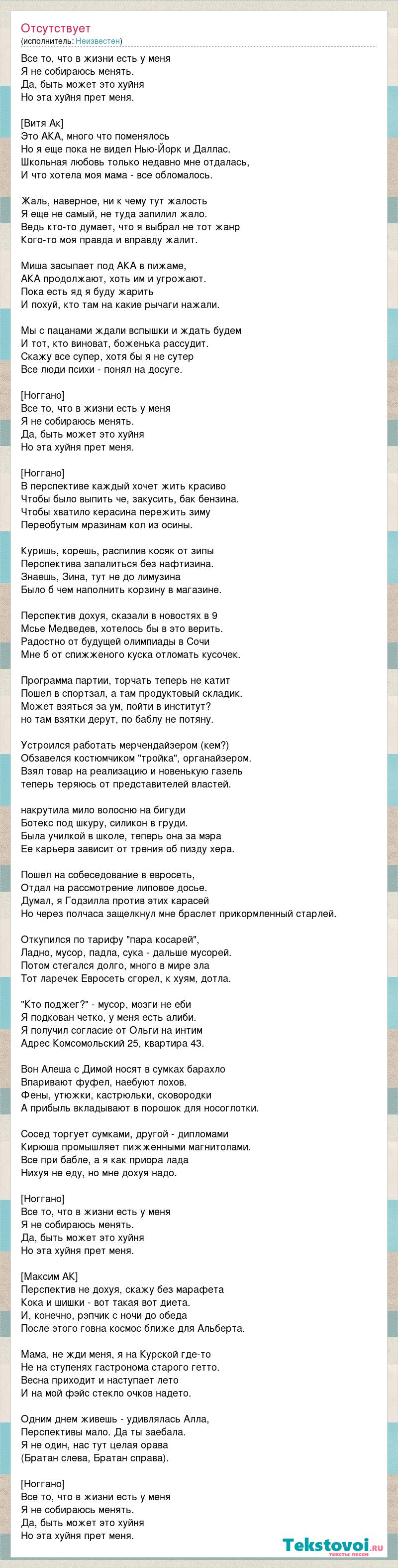 Все то, что в жизни есть у меня Я не собираюсь менять. Да, быть может это хуйня Но эта хуйня прет меня. [Витя Ак] Это АКА, много что поменялось Но я еще пока не видел Нью-Йорк и Даллас. Школьная любовь только недавно мне отдалась, И что хотела моя мама - все обломалось. Жаль, наверное, ни к чему тут жалость Я еще не самый, не туда запилил жало. Ведь кто-то думает, что я выбрал не тот жанр Кого-то моя правда и вправду жалит. Миша засыпает под АКА в пижаме, АКА продолжают, хоть им и угрожают. Пока есть яд я буду жарить И похуй, кто там на какие рычаги нажали. Мы с пацанами ждали вспышки и ждать будем И тот, кто виноват, боженька рассудит. Скажу все супер, хотя бы я не сутер Все люди психи - понял на досуге. [Ноггано] Все то, что в жизни есть у меня Я не собираюсь менять. Да, быть может это хуйня Но эта хуйня прет меня. [Ноггано] В перспективе каждый хочет жить красиво Чтобы было выпить че, закусить, бак бензина. Чтобы хватило керасина пережить зиму Переобутым мразинам кол из осины. Куришь, корешь, распилив косяк от зипы Перспектива запалиться без нафтизина. Знаешь, Зина, тут не до лимузина Было б чем наполнить корзину в магазине. Перспектив дохуя, сказали в новостях в 9 Мсье Медведев, хотелось бы в это верить. Радостно от будущей олимпиады в Сочи Мне б от спижженого куска отломать кусочек. Программа партии, торчать теперь не катит Пошел в спортзал, а там продуктовый складик. Может взяться за ум, пойти в институт? но там взятки дерут, по баблу не потяну. Устроился работать мерчендайзером (кем?) Обзавелся костюмчиком "тройка", органайзером. Взял товар на реализацию и новенькую газель теперь теряюсь от представителей властей. накрутила мило волосню на бигуди Ботекс под шкуру, силикон в груди. Была училкой в школе, теперь она за мэра Ее карьера зависит от трения об пизду хера. Пошел на собеседование в евросеть, Отдал на рассмотрение липовое досье. Думал, я Годзилла против этих карасей Но через полчаса защелкнул мне браслет прикормленный старлей. Откупился по тарифу "пара косарей", Ладно, мусор, падла, сука - дальше мусорей. Потом стегался долго, много в мире зла Тот ларечек Евросеть сгорел, к хуям, дотла. "Кто поджег?" - мусор, мозги не еби Я подкован четко, у меня есть алиби. Я получил согласие от Ольги на интим Адрес Комсомольский 25, квартира 43. Вон Алеша с Димой носят в сумках барахло Впаривают фуфел, наебуют лохов. Фены, утюжки, кастрюльки, сковородки А прибыль вкладывают в порошок для носоглотки. Сосед торгует сумками, другой - дипломами Кирюша промышляет пижженными магнитолами. Все при бабле, а я как приора лада Нихуя не еду, но мне дохуя надо. [Ноггано] Все то, что в жизни есть у меня Я не собираюсь менять. Да, быть может это хуйня Но эта хуйня прет меня. [Максим АК] Перспектив не дохуя, скажу без марафета Кока и шишки - вот такая вот диета. И, конечно, рэпчик с ночи до обеда После этого говна космос ближе для Альберта. Мама, не жди меня, я на Курской где-то Не на ступенях гастронома старого гетто. Весна приходит и наступает лето И на мой фэйс стекло очков надето. Одним днем живешь - удивлялась Алла, Перспективы мало. Да ты заебала. Я не один, нас тут целая орава (Братан слева, Братан справа). [Ноггано] Все то, что в жизни есть у меня Я не собираюсь менять. Да, быть может это хуйня Но эта хуйня прет меня.