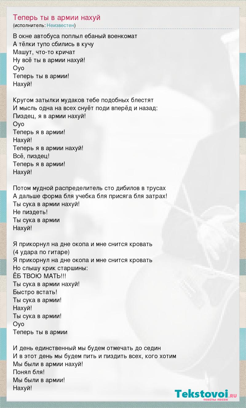 В окне автобуса поплыл ебаный военкомат А тёлки тупо сбились в кучу Машут, что-то кричат Ну всё ты в армии нахуй! Оуо Теперь ты в армии! Нахуй! Кругом затылки мудаков тебе подобных блестят И мысль одна на всех снуёт поди вперёд и назад: Пиздец, я в армии нахуй! Оуо Теперь я в армии! Нахуй! Теперь я в армии нахуй! Всё, пиздец! Теперь я в армии! Нахуй! Потом мудной распределитель сто дибилов в трусах А дальше форма бля учебка бля присяга бля затрах! Ты сука в армии нахуй! Не пиздеть! Ты сука в армии Нахуй! Я прикорнул на дне окопа и мне снится кровать (4 удара по гитаре) Я прикорнул на дне окопа и мне снится кровать Но слышу крик старшины: ЁБ ТВОЮ МАТЬ!!! Ты сука в армии нахуй! Быстро встать! Ты сука в армии! Нахуй! Ты сука в армии! Оуо Теперь ты в армии И день единственный мы будем отмечать до седин И в этот день мы будем пить и пиздить всех, кого хотим Мы были в армии нахуй! Понял бля! Мы были в армии! Нахуй!