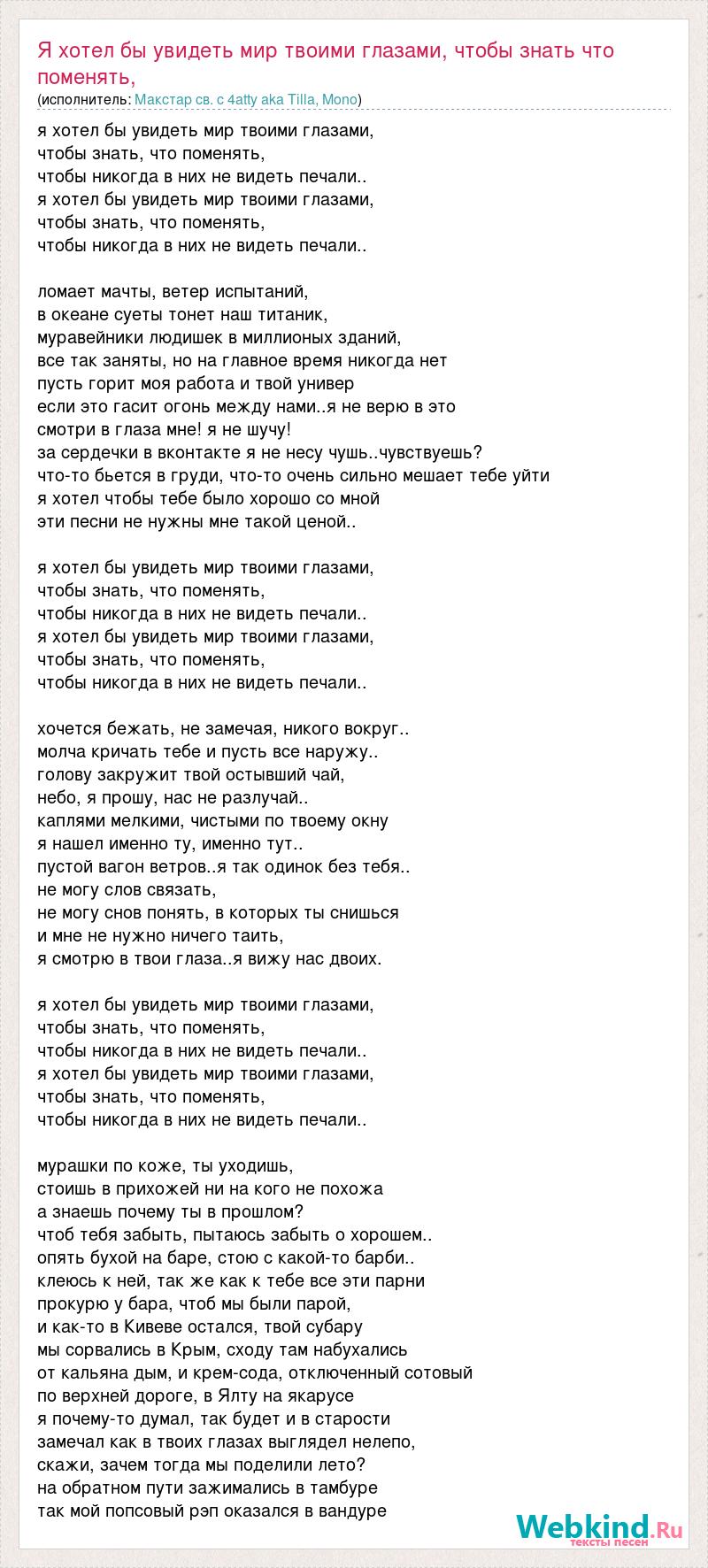 я хотел бы увидеть мир твоими глазами, чтобы знать, что поменять, чтобы никогда в них не видеть печали.. я хотел бы увидеть мир твоими глазами, чтобы знать, что поменять, чтобы никогда в них не видеть печали.. ломает мачты, ветер испытаний, в океане суеты тонет наш титаник, муравейники людишек в миллионых зданий, все так заняты, но на главное время никогда нет пусть горит моя работа и твой универ если это гасит огонь между нами..я не верю в это смотри в глаза мне! я не шучу! за сердечки в вконтакте я не несу чушь..чувствуешь? что-то бьется в груди, что-то очень сильно мешает тебе уйти я хотел чтобы тебе было хорошо со мной эти песни не нужны мне такой ценой.. я хотел бы увидеть мир твоими глазами, чтобы знать, что поменять, чтобы никогда в них не видеть печали.. я хотел бы увидеть мир твоими глазами, чтобы знать, что поменять, чтобы никогда в них не видеть печали.. хочется бежать, не замечая, никого вокруг.. молча кричать тебе и пусть все наружу.. голову закружит твой остывший чай, небо, я прошу, нас не разлучай.. каплями мелкими, чистыми по твоему окну я нашел именно ту, именно тут.. пустой вагон ветров..я так одинок без тебя.. не могу слов связать, не могу снов понять, в которых ты снишься и мне не нужно ничего таить, я смотрю в твои глаза..я вижу нас двоих. я хотел бы увидеть мир твоими глазами, чтобы знать, что поменять, чтобы никогда в них не видеть печали.. я хотел бы увидеть мир твоими глазами, чтобы знать, что поменять, чтобы никогда в них не видеть печали.. мурашки по коже, ты уходишь, стоишь в прихожей ни на кого не похожа а знаешь почему ты в прошлом? чтоб тебя забыть, пытаюсь забыть о хорошем.. опять бухой на баре, стою с какой-то барби.. клеюсь к ней, так же как к тебе все эти парни прокурю у бара, чтоб мы были парой, и как-то в Кивеве остался, твой субару мы сорвались в Крым, сходу там набухались от кальяна дым, и крем-сода, отключенный сотовый по верхней дороге, в Ялту на якарусе я почему-то думал, так будет и в старости замечал как в твоих глазах выглядел нелепо, скажи, зачем тогда мы поделили лето? на обратном пути зажимались в тамбуре так мой попсовый рэп оказался в вандуре