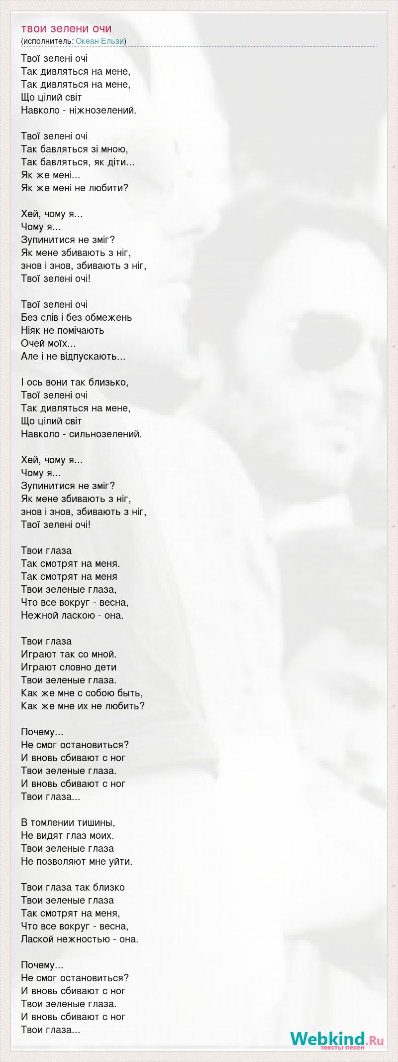 Твої зелені очі Так дивляться на мене, Так дивляться на мене, Що цілий світ Навколо - ніжнозелений. Твої зелені очі Так бавляться зі мною, Так бавляться, як діти... Як же мені... Як же мені не любити? Хей, чому я... Чому я... Зупинитися не зміг? Як мене збивають з ніг, знов і знов, збивають з ніг, Твої зелені очі! Твої зелені очі Без слів і без обмежень Ніяк не помічають Очей моїх... Але і не відпускають... І ось вони так близько, Твої зелені очі Так дивляться на мене, Що цілий світ Навколо - сильнозелений. Хей, чому я... Чому я... Зупинитися не зміг? Як мене збивають з ніг, знов і знов, збивають з ніг, Твої зелені очі! Твои глаза Так смотрят на меня. Так смотрят на меня Твои зеленые глаза, Что все вокруг - весна, Нежной ласкою - она. Твои глаза Играют так со мной. Играют словно дети Твои зеленые глаза. Как же мне с собою быть, Как же мне их не любить? Почему... Не смог остановиться? И вновь сбивают с ног Твои зеленые глаза. И вновь сбивают с ног Твои глаза... В томлении тишины, Не видят глаз моих. Твои зеленые глаза Не позволяют мне уйти. Твои глаза так близко Твои зеленые глаза Так смотрят на меня, Что все вокруг - весна, Лаской нежностью - она. Почему... Не смог остановиться? И вновь сбивают с ног Твои зеленые глаза. И вновь сбивают с ног Твои глаза...