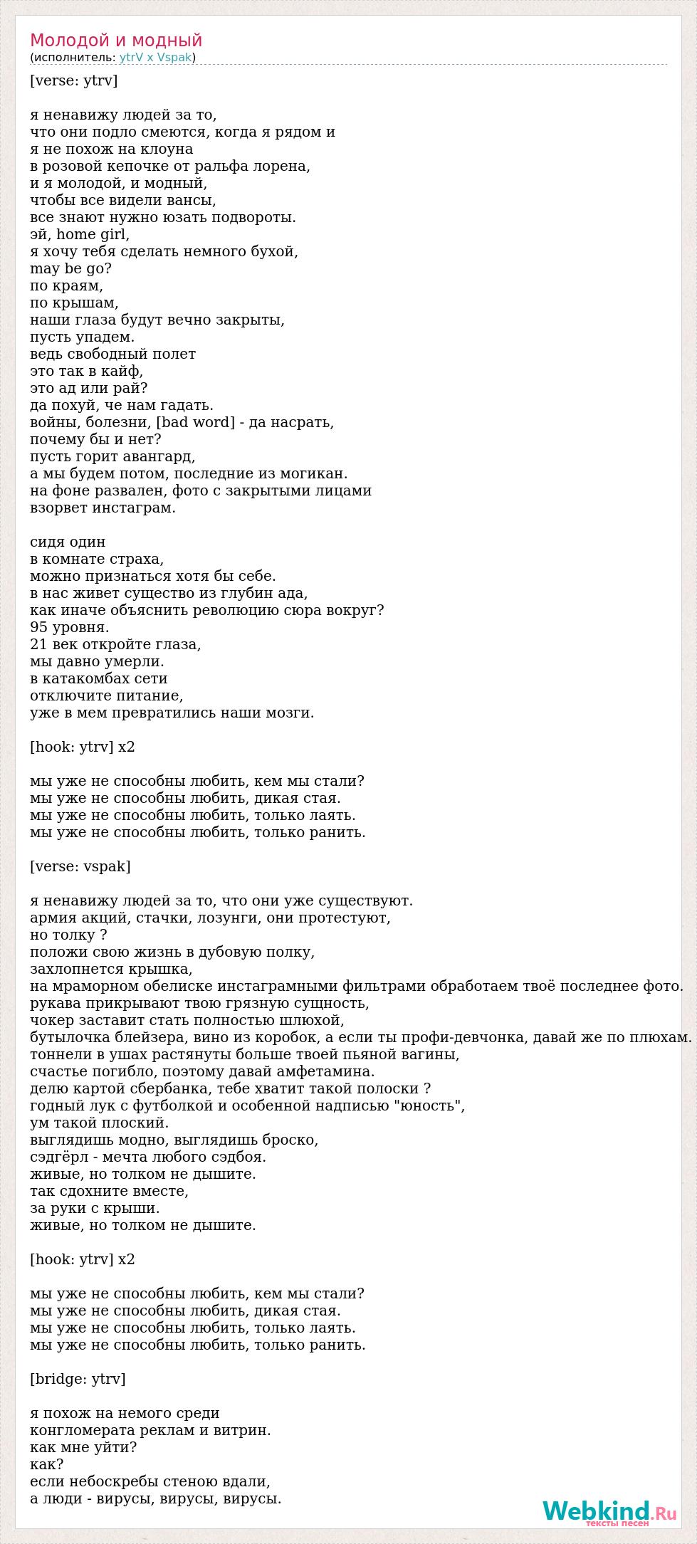 [verse: ytrv] я ненавижу людей за то, что они подло смеются, когда я рядом и я не похож на клоуна в розовой кепочке от ральфа лорена, и я молодой, и модный, чтобы все видели вансы, все знают нужно юзать подвороты. эй, home girl, я хочу тебя сделать немного бухой, may be go? по краям, по крышам, наши глаза будут вечно закрыты, пусть упадем. ведь свободный полет это так в кайф, это ад или рай? да похуй, че нам гадать. войны, болезни, [bad word] - да насрать, почему бы и нет? пусть горит авангард, а мы будем потом, последние из могикан. на фоне развален, фото с закрытыми лицами взорвет инстаграм. сидя один в комнате страха, можно признаться хотя бы себе. в нас живет существо из глубин ада, как иначе объяснить революцию сюра вокруг? 95 уровня. 21 век откройте глаза, мы давно умерли. в катакомбах сети отключите питание, уже в мем превратились наши мозги. [hook: ytrv] x2 мы уже не способны любить, кем мы стали? мы уже не способны любить, дикая стая. мы уже не способны любить, только лаять. мы уже не способны любить, только ранить. [verse: vspak] я ненавижу людей за то, что они уже существуют. армия акций, стачки, лозунги, они протестуют, но толку ? положи свою жизнь в дубовую полку, захлопнется крышка, на мраморном обелиске инстаграмными фильтрами обработаем твоё последнее фото. рукава прикрывают твою грязную сущность, чокер заставит стать полностью шлюхой, бутылочка блейзера, вино из коробок, а если ты профи-девчонка, давай же по плюхам. тоннели в ушах растянуты больше твоей пьяной вагины, счастье погибло, поэтому давай амфетамина. делю картой сбербанка, тебе хватит такой полоски ? годный лук с футболкой и особенной надписью "юность", ум такой плоский. выглядишь модно, выглядишь броско, сэдгёрл - мечта любого сэдбоя. живые, но толком не дышите. так сдохните вместе, за руки с крыши. живые, но толком не дышите. [hook: ytrv] x2 мы уже не способны любить, кем мы стали? мы уже не способны любить, дикая стая. мы уже не способны любить, только лаять. мы уже не способны любить, только ранить. [bridge: ytrv] я похож на немого среди конгломерата реклам и витрин. как мне уйти? как? если небоскребы стеною вдали, а люди - вирусы, вирусы, вирусы.