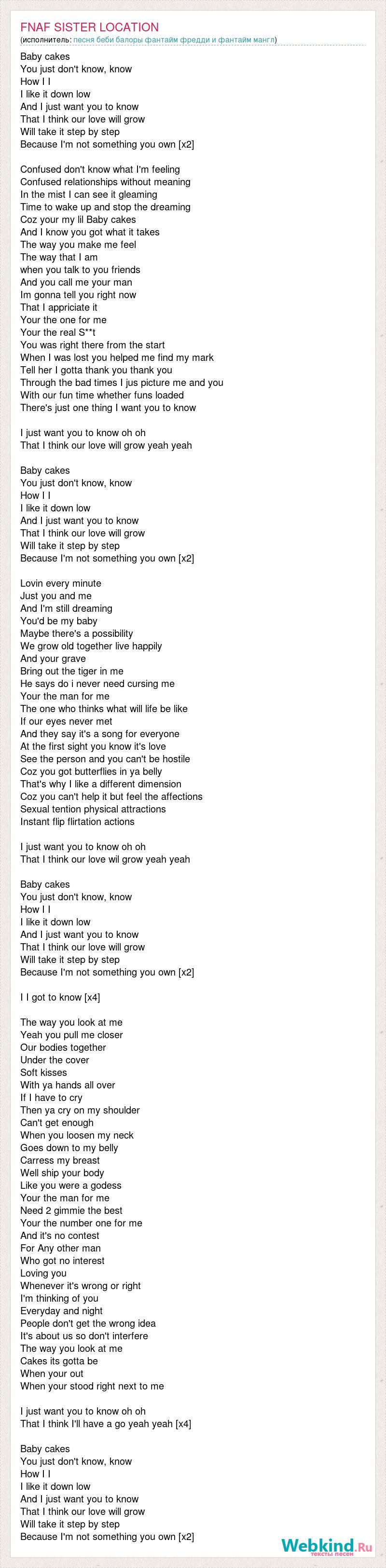 Baby cakes You just don't know, know How I I I like it down low And I just want you to know That I think our love will grow Will take it step by step Because I'm not something you own [x2] Confused don't know what I'm feeling Confused relationships without meaning In the mist I can see it gleaming Time to wake up and stop the dreaming Coz your my lil Baby cakes And I know you got what it takes The way you make me feel The way that I am when you talk to you friends And you call me your man Im gonna tell you right now That I appriciate it Your the one for me Your the real S**t You was right there from the start When I was lost you helped me find my mark Tell her I gotta thank you thank you Through the bad times I jus picture me and you With our fun time whether funs loaded There's just one thing I want you to know I just want you to know oh oh That I think our love will grow yeah yeah Baby cakes You just don't know, know How I I I like it down low And I just want you to know That I think our love will grow Will take it step by step Because I'm not something you own [x2] Lovin every minute Just you and me And I'm still dreaming You'd be my baby Maybe there's a possibility We grow old together live happily And your grave Bring out the tiger in me He says do i never need cursing me Your the man for me The one who thinks what will life be like If our eyes never met And they say it's a song for everyone At the first sight you know it's love See the person and you can't be hostile Coz you got butterflies in ya belly That's why I like a different dimension Coz you can't help it but feel the affections Sexual tention physical attractions Instant flip flirtation actions I just want you to know oh oh That I think our love wil grow yeah yeah Baby cakes You just don't know, know How I I I like it down low And I just want you to know That I think our love will grow Will take it step by step Because I'm not something you own [x2] I I got to know [x4] The way you look at me Yeah you pull me closer Our bodies together Under the cover Soft kisses With ya hands all over If I have to cry Then ya cry on my shoulder Can't get enough When you loosen my neck Goes down to my belly Carress my breast Well ship your body Like you were a godess Your the man for me Need 2 gimmie the best Your the number one for me And it's no contest For Any other man Who got no interest Loving you Whenever it's wrong or right I'm thinking of you Everyday and night People don't get the wrong idea It's about us so don't interfere The way you look at me Cakes its gotta be When your out When your stood right next to me I just want you to know oh oh That I think I'll have a go yeah yeah [x4] Baby cakes You just don't know, know How I I I like it down low And I just want you to know That I think our love will grow Will take it step by step Because I'm not something you own [x2]