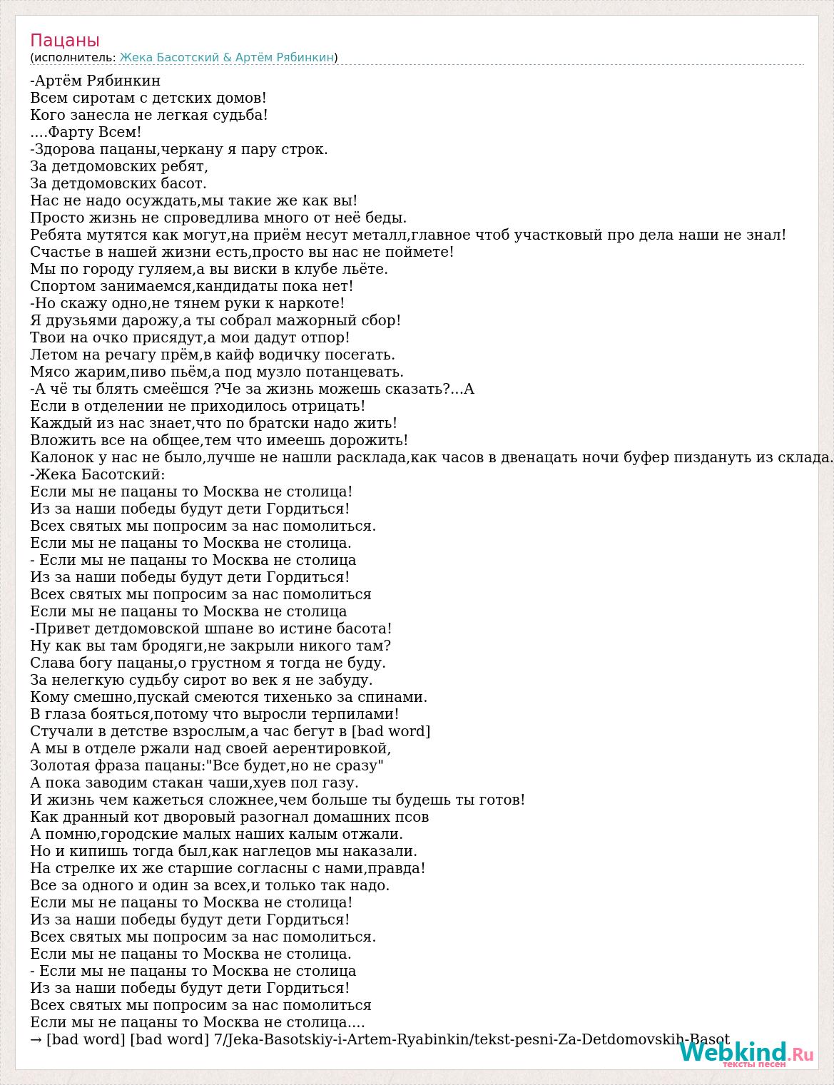 -Артём Рябинкин Всем сиротам с детских домов! Кого занесла не легкая судьба! ....Фарту Всем! -Здорова пацаны,черкану я пару строк. За детдомовских ребят, За детдомовских басот. Нас не надо осуждать,мы такие же как вы! Просто жизнь не спроведлива много от неё беды. Ребята мутятся как могут,на приём несут металл,главное чтоб участковый про дела наши не знал! Счастье в нашей жизни есть,просто вы нас не поймете! Мы по городу гуляем,а вы виски в клубе льёте. Спортом занимаемся,кандидаты пока нет! -Но скажу одно,не тянем руки к наркоте! Я друзьями дарожу,а ты собрал мажорный сбор! Твои на очко присядут,а мои дадут отпор! Летом на речагу прём,в кайф водичку посегать. Мясо жарим,пиво пьём,а под музло потанцевать. -А чё ты блять смеёшся ?Че за жизнь можешь сказать?...А Если в отделении не приходилось отрицать! Каждый из нас знает,что по братски надо жить! Вложить все на общее,тем что имеешь дорожить! Калонок у нас не было,лучше не нашли расклада,как часов в двенацать ночи буфер пиздануть из склада. -Жека Басотский: Если мы не пацаны то Москва не столица! Из за наши победы будут дети Гордиться! Всех святых мы попросим за нас помолиться. Если мы не пацаны то Москва не столица. - Если мы не пацаны то Москва не столица Из за наши победы будут дети Гордиться! Всех святых мы попросим за нас помолиться Если мы не пацаны то Москва не столица -Привет детдомовской шпане во истине басота! Ну как вы там бродяги,не закрыли никого там? Слава богу пацаны,о грустном я тогда не буду. За нелегкую судьбу сирот во век я не забуду. Кому смешно,пускай смеются тихенько за спинами. В глаза бояться,потому что выросли терпилами! Стучали в детстве взрослым,а час бегут в [bad word] А мы в отделе ржали над своей аерентировкой, Золотая фраза пацаны:"Все будет,но не сразу" А пока заводим стакан чаши,хуев пол газу. И жизнь чем кажеться сложнее,чем больше ты будешь ты готов! Как дранный кот дворовый разогнал домашних псов А помню,городские малых наших калым отжали. Но и кипишь тогда был,как наглецов мы наказали. На стрелке их же старшие согласны с нами,правда! Все за одного и один за всех,и только так надо. Если мы не пацаны то Москва не столица! Из за наши победы будут дети Гордиться! Всех святых мы попросим за нас помолиться. Если мы не пацаны то Москва не столица. - Если мы не пацаны то Москва не столица Из за наши победы будут дети Гордиться! Всех святых мы попросим за нас помолиться Если мы не пацаны то Москва не столица.... → [bad word] [bad word] 7/Jeka-Basotskiy-i-Artem-Ryabinkin/tekst-pesni-Za-Detdomovskih-Basot