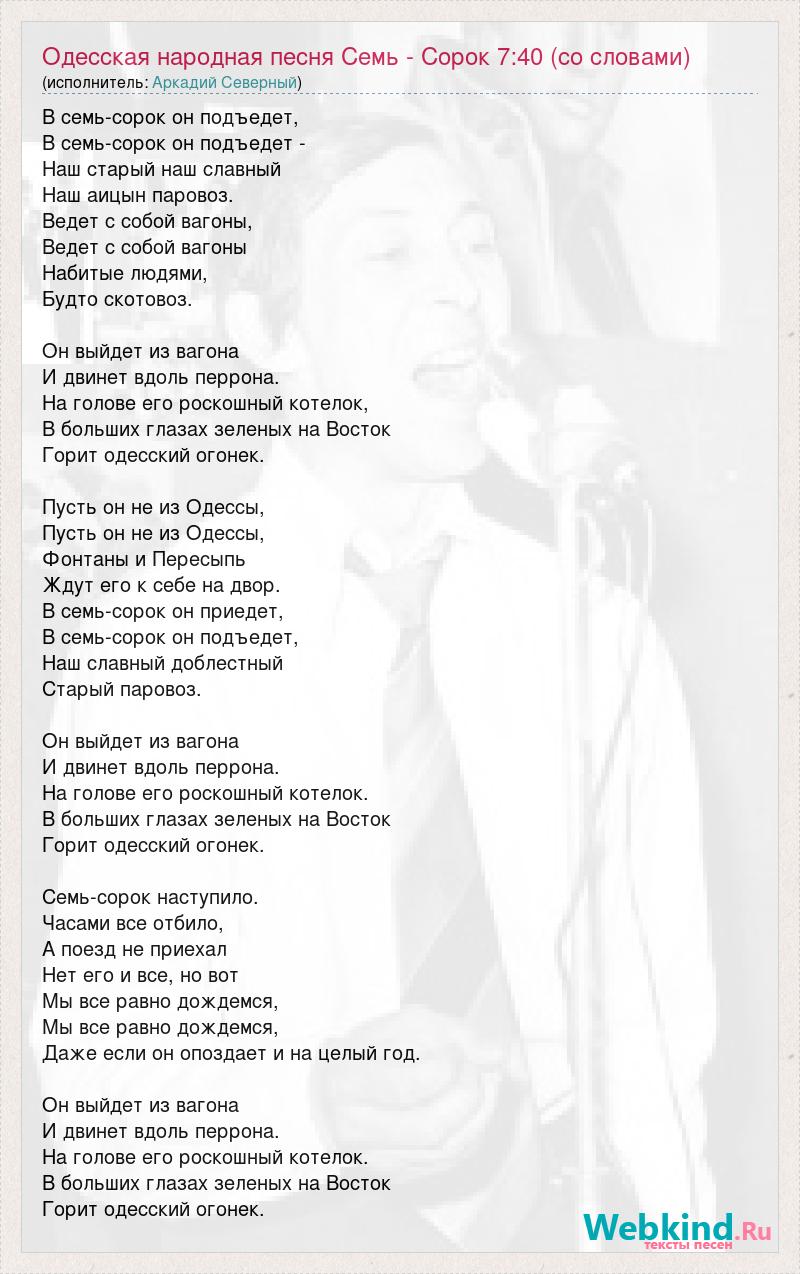 В семь-сорок он подъедет, В семь-сорок он подъедет - Наш старый наш славный Наш аицын паровоз. Ведет с собой вагоны, Ведет с собой вагоны Набитые людями, Будто скотовоз. Он выйдет из вагона И двинет вдоль перрона. На голове его роскошный котелок, В больших глазах зеленых на Восток Горит одесский огонек. Пусть он не из Одессы, Пусть он не из Одессы, Фонтаны и Пересыпь Ждут его к себе на двор. В семь-сорок он приедет, В семь-сорок он подъедет, Наш славный доблестный Старый паровоз. Он выйдет из вагона И двинет вдоль перрона. На голове его роскошный котелок. В больших глазах зеленых на Восток Горит одесский огонек. Семь-сорок наступило. Часами все отбило, А поезд не приехал Нет его и все, но вот Мы все равно дождемся, Мы все равно дождемся, Даже если он опоздает и на целый год. Он выйдет из вагона И двинет вдоль перрона. На голове его роскошный котелок. В больших глазах зеленых на Восток Горит одесский огонек.