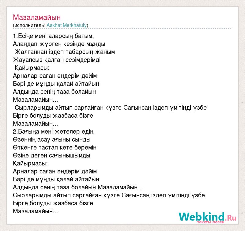 1.Есіңе мені аларсың бағым, Алаңдап жүрген кезіңде мұңды Жалғаннан іздеп табарсың жаным Жауапсыз қалған сезімдерімді Қайырмасы: Арналар саған әндерім дәйім Бәрі де мұңды қалай айтайын Алдыңда сенің таза болайын Мазаламайын... Сырларымды айтып сарғайған күзге Сағынсаң іздеп үмітіңді үзбе Бірге болуды жазбаса бізге Мазаламайын... 2.Бағыңа мені жетелер едің Өзеннің асау ағыны сынды Өткенге тастап кете беремін Өзіңе деген сағынышымды Қайырмасы: Арналар саған әндерім дәйім Бәрі де мұңды қалай айтайын Алдыңда сенің таза болайын Мазаламайын... Сырларымды айтып сарғайған күзге Сағынсаң іздеп үмітіңді үзбе Бірге болуды жазбаса бізге Мазаламайын...