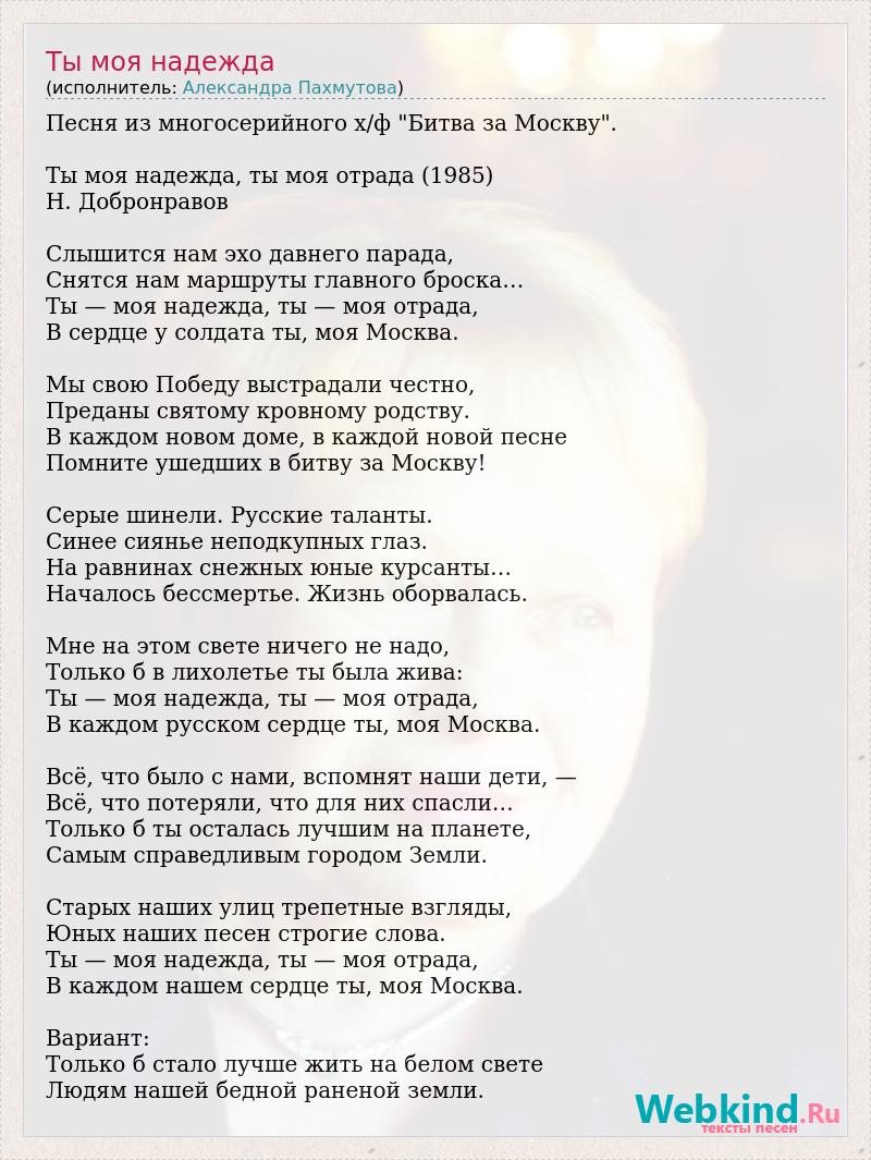 Песня из многосерийного х/ф "Битва за Москву". Ты моя надежда, ты моя отрада (1985) Н. Добронравов Слышится нам эхо давнего парада, Снятся нам маршруты главного броска… Ты — моя надежда, ты — моя отрада, В сердце у солдата ты, моя Москва. Мы свою Победу выстрадали честно, Преданы святому кровному родству. В каждом новом доме, в каждой новой песне Помните ушедших в битву за Москву! Серые шинели. Русские таланты. Синее сиянье неподкупных глаз. На равнинах снежных юные курсанты… Началось бессмертье. Жизнь оборвалась. Мне на этом свете ничего не надо, Только б в лихолетье ты была жива: Ты — моя надежда, ты — моя отрада, В каждом русском сердце ты, моя Москва. Всё, что было с нами, вспомнят наши дети, — Всё, что потеряли, что для них спасли… Только б ты осталась лучшим на планете, Самым справедливым городом Земли. Старых наших улиц трепетные взгляды, Юных наших песен строгие слова. Ты — моя надежда, ты — моя отрада, В каждом нашем сердце ты, моя Москва. Вариант: Только б стало лучше жить на белом свете Людям нашей бедной раненой земли.