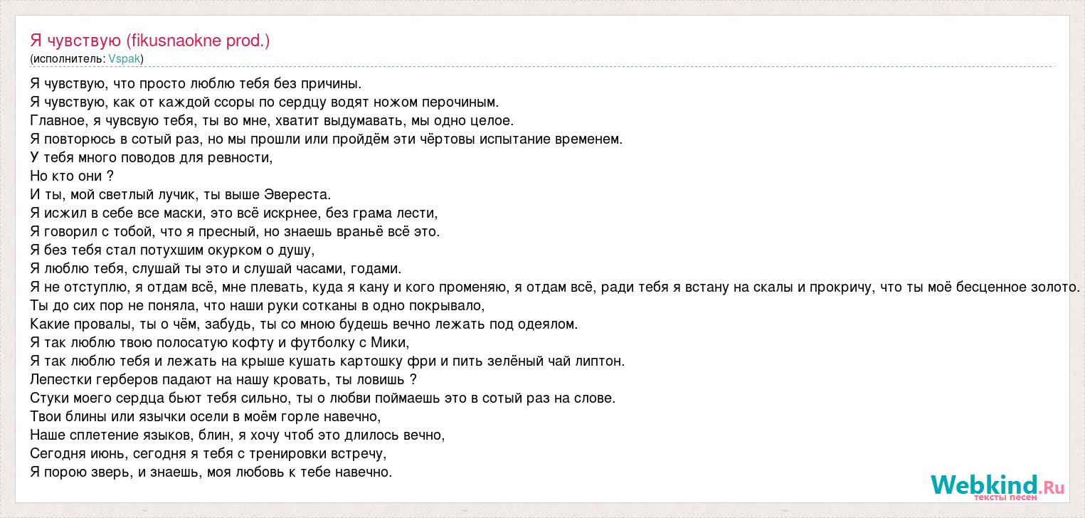 Я чувствую, что просто люблю тебя без причины. Я чувствую, как от каждой ссоры по сердцу водят ножом перочиным. Главное, я чувсвую тебя, ты во мне, хватит выдумавать, мы одно целое. Я повторюсь в сотый раз, но мы прошли или пройдём эти чёртовы испытание временем. У тебя много поводов для ревности, Но кто они ? И ты, мой светлый лучик, ты выше Эвереста. Я исжил в себе все маски, это всё искрнее, без грама лести, Я говорил с тобой, что я пресный, но знаешь враньё всё это. Я без тебя стал потухшим окурком о душу, Я люблю тебя, слушай ты это и слушай часами, годами. Я не отступлю, я отдам всё, мне плевать, куда я кану и кого променяю, я отдам всё, ради тебя я встану на скалы и прокричу, что ты моё бесценное золото. Ты до сих пор не поняла, что наши руки сотканы в одно покрывало, Какие провалы, ты о чём, забудь, ты со мною будешь вечно лежать под одеялом. Я так люблю твою полосатую кофту и футболку с Мики, Я так люблю тебя и лежать на крыше кушать картошку фри и пить зелёный чай липтон. Лепестки герберов падают на нашу кровать, ты ловишь ? Стуки моего сердца бьют тебя сильно, ты о любви поймаешь это в сотый раз на слове. Твои блины или язычки осели в моём горле навечно, Наше сплетение языков, блин, я хочу чтоб это длилось вечно, Сегодня июнь, сегодня я тебя с тренировки встречу, Я порою зверь, и знаешь, моя любовь к тебе навечно.