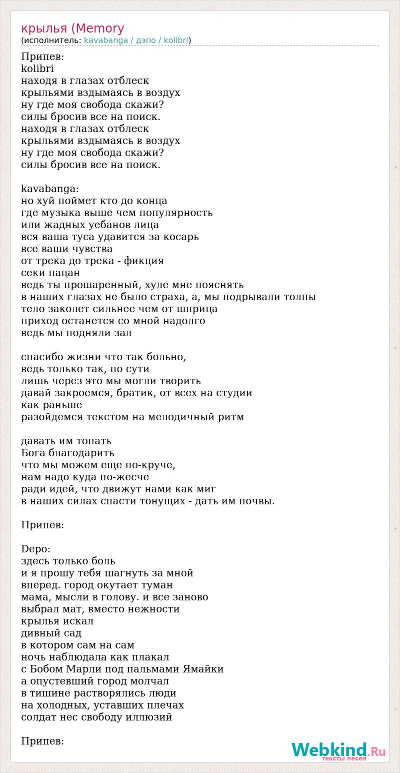 Припев: kolibri находя в глазах отблеск крыльями вздымаясь в воздух ну где моя свобода скажи? силы бросив все на поиск. находя в глазах отблеск крыльями вздымаясь в воздух ну где моя свобода скажи? силы бросив все на поиск. kavabanga: но хуй поймет кто до конца где музыка выше чем популярность или жадных уебанов лица вся ваша туса удавится за косарь все ваши чувства от трека до трека - фикция секи пацан ведь ты прошаренный, хуле мне пояснять в наших глазах не было страха, а, мы подрывали толпы тело заколет сильнее чем от шприца приход останется со мной надолго ведь мы подняли зал спасибо жизни что так больно, ведь только так, по сути лишь через это мы могли творить давай закроемся, братик, от всех на студии как раньше разойдемся текстом на мелодичный ритм давать им топать Бога благодарить что мы можем еще по-круче, нам надо куда по-жесче ради идей, что движут нами как миг в наших силах спасти тонущих - дать им почвы. Припев: Depo: здесь только боль и я прошу тебя шагнуть за мной вперед. город окутает туман мама, мысли в голову. и все заново выбрал мат, вместо нежности крылья искал дивный сад в котором сам на сам ночь наблюдала как плакал с Бобом Марли под пальмами Ямайки а опустевший город молчал в тишине растворялись люди на холодных, уставших плечах солдат нес свободу иллюзий Припев: