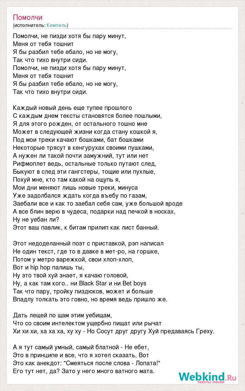Помолчи, не пизди хотя бы пару минут, Меня от тебя тошнит Я бы разбил тебе ебало, но не могу, Так что тихо внутри сиди. Помолчи, не пизди хотя бы пару минут, Меня от тебя тошнит Я бы разбил тебе ебало, но не могу, Так что тихо внутри сиди. Каждый новый день еще тупее прошлого С каждым днем тексты становятся более пошлыми, Я для этого рожден, от остального тошно мне Может в следующей жизни когда стану кошкой я, Под мои треки качают бошками, бат бошками Некоторые трясут в кенгурухах своими пушками, А нужен ли такой почти замужний, тут или нет Рифмоплет ведь, остальные только путают след, Быкуют в след эти гангстеры, тощие или пухлые, Похуй мне, кто там какой на ощупь я, Мои дни меняют лишь новые треки, минуса Уже задолбался ждать когда въебу по газам, Заебали все и как то заебал себя сам, уже большой вроде А все блин верю в чудеса, подарки над печкой в носках, Ну не уебан ли? Этот ваш павлик, к битам прилип как лист банный. Этот недоделанный поэт с приставкой, рэп написал Не один текст, где то в давке в мет-ро, на горшке, Потом у метро варежкой, свои хлоп-хлоп, Вот и hip hop палишь ты, Ну это твой хуй знает, я качаю головой, Ну, а как там кого.. ни Black Star и ни Bet boys Так что пару, тройку пиздюков, может и больше Впадлу толкать это говно, но время ведь пришло же. Дать лещей по щам этим уебищам, Что со своим интелектом ущербно пищат или рычат Хи хи хи, ха ха ха, ху ху - Но Сосут друг другу Хуй предаваясь Греху. А я тут самый умный, самый блатной - Не ебет, Это в принципе и все, что я хотел сказать, Вот Это как анекдот: "Смеяться после слова - Лопата!" Его тут нет, да? Зато у него много ватного мата.
