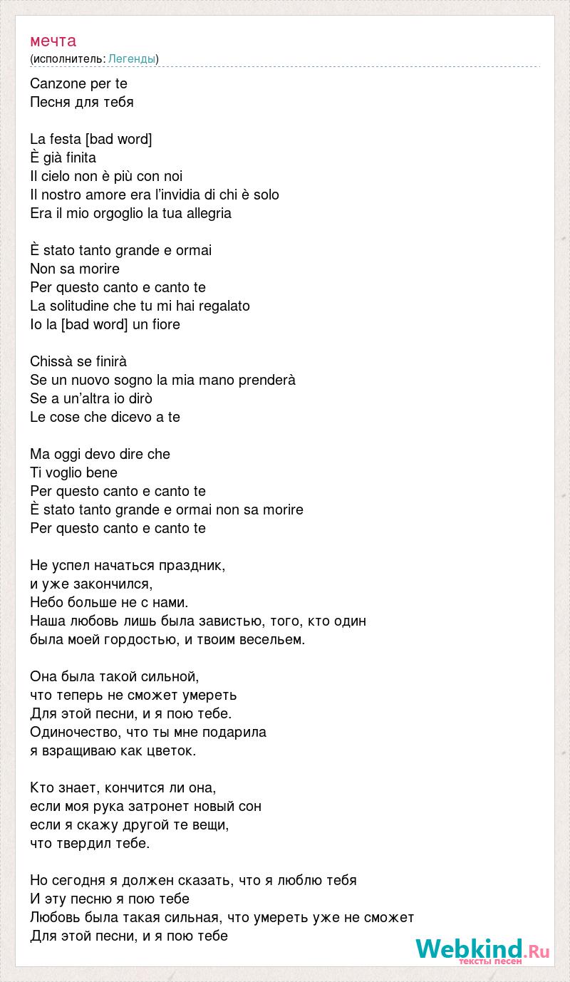 Canzone per te Песня для тебя La festa [bad word] È già finita Il cielo non è più con noi Il nostro amore era l’invidia di chi è solo Era il mio orgoglio la tua allegria È stato tanto grande e ormai Non sa morire Per questo canto e canto te La solitudine che tu mi hai regalato Io la [bad word] un fiore Chissà se finirà Se un nuovo sogno la mia mano prenderà Se a un’altra io dirò Le cose che dicevo a te Ma oggi devo dire che Ti voglio bene Per questo canto e canto te È stato tanto grande e ormai non sa morire Per questo canto e canto te Не успел начаться праздник, и уже закончился, Небо больше не с нами. Наша любовь лишь была завистью, того, кто один была моей гордостью, и твоим весельем. Она была такой сильной, что теперь не сможет умереть Для этой песни, и я пою тебе. Одиночество, что ты мне подарила я взращиваю как цветок. Кто знает, кончится ли она, если моя рука затронет новый сон если я скажу другой те вещи, что твердил тебе. Но сегодня я должен сказать, что я люблю тебя И эту песню я пою тебе Любовь была такая сильная, что умереть уже не сможет Для этой песни, и я пою тебе
