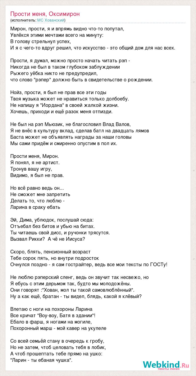 Мирон, прости, я и впрямь видно что-то попутал, Увлёкся этими мечтами всего на минуту: В голову стрельнул успех, И я с чего-то вдруг решил, что искусство - это общий дом для нас всех. Прости, я думал, можно просто начать читать рэп - Никогда не был в таком глубоком заблуждении Рыжего уёбка никто не предупредил, что слово "рэпер" должно быть в свидетельстве о рождении. Нойз, прости, я был не прав все эти годы Твоя музыка может не нравиться только долбоебу. Не напишу я "Иордана" в своей жалкой жизни. Хочешь, приходи и ещё разок меня отпизди. Не был на рэп Мьюзик, не благословил Влад Валов, Я не внёс в культуру вклад, сделав батл на двадцать лямов Баста может не объявлять награды за наши головы Мы сами придём и смиренно опустим в пол их. Прости меня, Мирон. Я понял, я не артист. Тронув вашу игру, Видимо, я был не прав. Но всё равно ведь он... Не сможет мне запретить Делать то, что люблю - Ларина в сраку ебать Эй, Дима, ублюдок, послушай сюда: Отъебал без битов и убью на битах. Ты читаешь свой дисс, и ручонки трясутся. Вызвал Рикки? А чё не Иисуса? Скоро, блять, пенсионный возраст Тебе сорок пять, но внутри подросток Очнулся поздно - я сам гострайтер, ведь все мои тексты по ГОСТу! Не люблю рэперский сленг, ведь он звучит так несвежо, но Я ебусь с этим дерьмом так, будто мы молодожёны. Они говорят :"Хован, мол ты такой самовлюблённый". Ну а как ещё, братан - ты видел, блядь, какой я клёвый? Влетаю с ноги на похороны Ларина Все кричат "Воу-воу, Батя в здании"! Ебало в фарш, я ногами на могиле, Похоронный марш - мой кавер на укулеле Со всей семьёй стану в очередь к гробу, Но не затем, чтоб целовать тебя в лобик, А чтоб прошептать тебе прямо на ушко: "Ларин - ты ебаная чушка".
