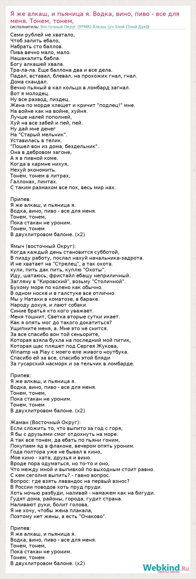 Семи рублей не хватало, Чтоб залить ебало, Набрать сто баллов. Пива вечно мало, мало. Нашакалить бабла. Богу алкашей хвала. Тра-ла-ла. Еще баллона два и все дела. Падал, вставал, блевал, на прохожих гнал, гнал. Дома скандал. Вечно пьяный в кал кольцо в ломбард загнал. Вот я молодец. Ну все развод, пиздец. Жена по морде хлещет и кричит "подлец!" мне. На войне как на войне, хуйня. Лучше налей пополней, Хуй на все забей и пей, пей. Ну дай мне денег На "Старый мельник". Уставилась в телик. "Пошел вон из дома, бездельник". Она в дебровом загоне, А я в пивной коме. Когда в кармне нихуя, Нехуй экономить. Тонем, тонем в литрах, Галлонах, пинтах. С таким размахом все пох, весь мир нах. Припев: Я же алкаш, и пьяница я. Водка, вино, пиво - все для меня. Тонем, тонем, Пока стакан не уроним. Тонем, тонем В двухлитровом балоне. (x2) Ямыч (восточный Округ): Когда каждый день становится субботой, В пизду работу, послал нахуй начальника-задрота. И не хватает на "Стрелец", а так охота. хули, пить дак пить, куплю "Охоты". Иду, шатаюсь, фристайл ебашу неприличный. Загляну в "Кировский", возьму "Столичной". Бухому море по колено как обычно. В одном носке и в галстуке все отлично. Мы у Натахи в коматозе, в бараке. Народу дохуя, и лают собаки. Синие братья кто кого уважает. Меня тошнит, Светка вторые сутки икает. Как я опять мог до такого докатиться? Ущипните меня, а. Мне это не снится. За все спасибо вон той сеньорите, Которая взяла бухла на последний мой питик, Которая щас пляшет под Сергея Жукова, Winamp на Play с моего еле живого ноутбука. Спасибо ей за все, спасибо этой бляди За гусарский насморк и за тельчик в ломбарде. Припев: Я же алкаш, и пьяница я. Водка, вино, пиво - все для меня. Тонем, тонем, Пока стакан не уроним. Тонем, тонем В двухлитровом балоне. (x2) Жаман (Восточный Округ): Если сложить то, что выпито за год с горя, Я бы с друзьями смог отдохнуть на море. А так все тонем, да ебать по пьяни гоним, Покупаем яд в флаконе, вечером опять уроним. Года полтора уже не бывал в кино, Мое кино - хата, друзья и вино. Вроде пора одуматься, но то-то и оно, Что между мной и выпивкой по выходным стоит равно. С кем сеголня выпить? - гавно вопрос. Вопрос: где взять лавандос на первый взнос? В России поводов хоть пруд пруди. Хоть ночью разбуди, наливай - намажем как на бигуди. Гудят дома, районы, города, гудит страна. Наливают руки, болит голова. Я не хочу, чтобы жена плакала, Поэтому нет жены, а есть "Очаково". Припев: Я же алкаш, и пьяница я. Водка, вино, пиво - все для меня. Тонем, тонем, Пока стакан не уроним. Тонем, тонем В двухлитровом балоне. (x2)
