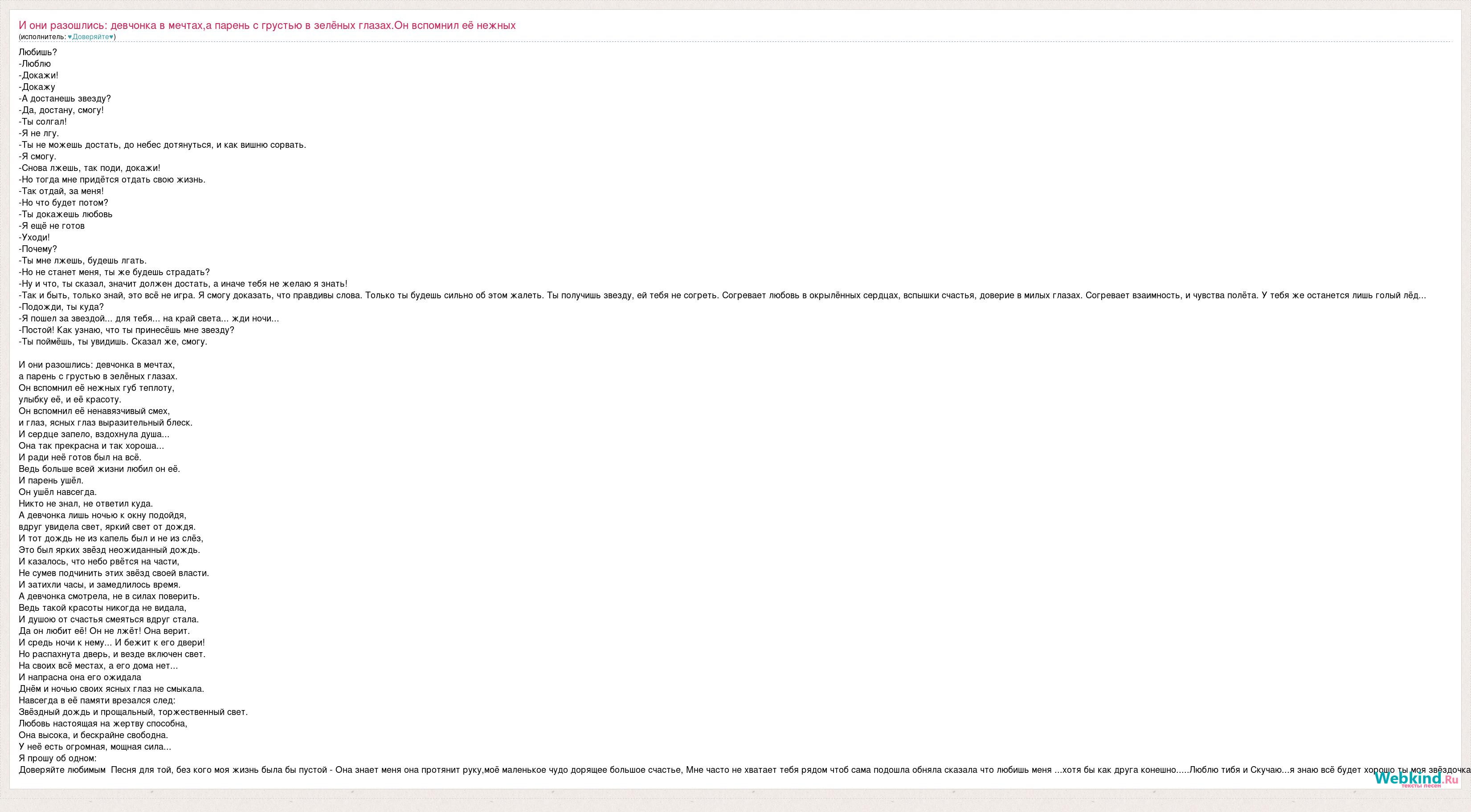 Любишь? -Люблю -Докажи! -Докажу -А достанешь звезду? -Да, достану, смогу! -Ты солгал! -Я не лгу. -Ты не можешь достать, до небес дотянуться, и как вишню сорвать. -Я смогу. -Снова лжешь, так поди, докажи! -Но тогда мне придётся отдать свою жизнь. -Так отдай, за меня! -Но что будет потом? -Ты докажешь любовь -Я ещё не готов -Уходи! -Почему? -Ты мне лжешь, будешь лгать. -Но не станет меня, ты же будешь страдать? -Ну и что, ты сказал, значит должен достать, а иначе тебя не желаю я знать! -Так и быть, только знай, это всё не игра. Я смогу доказать, что правдивы слова. Только ты будешь сильно об этом жалеть. Ты получишь звезду, ей тебя не согреть. Согревает любовь в окрылённых сердцах, вспышки счастья, доверие в милых глазах. Согревает взаимность, и чувства полёта. У тебя же останется лишь голый лёд... -Подожди, ты куда? -Я пошел за звездой... для тебя... на край света... жди ночи... -Постой! Как узнаю, что ты принесёшь мне звезду? -Ты поймёшь, ты увидишь. Сказал же, смогу. И они разошлись: девчонка в мечтах, а парень с грустью в зелёных глазах. Он вспомнил её нежных губ теплоту, улыбку её, и её красоту. Он вспомнил её ненавязчивый смех, и глаз, ясных глаз выразительный блеск. И сердце запело, вздохнула душа... Она так прекрасна и так хороша... И ради неё готов был на всё. Ведь больше всей жизни любил он её. И парень ушёл. Он ушёл навсегда. Никто не знал, не ответил куда. А девчонка лишь ночью к окну подойдя, вдруг увидела свет, яркий свет от дождя. И тот дождь не из капель был и не из слёз, Это был ярких звёзд неожиданный дождь. И казалось, что небо рвётся на части, Не сумев подчинить этих звёзд своей власти. И затихли часы, и замедлилось время. А девчонка смотрела, не в силах поверить. Ведь такой красоты никогда не видала, И душою от счастья смеяться вдруг стала. Да он любит её! Он не лжёт! Она верит. И средь ночи к нему... И бежит к его двери! Но распахнута дверь, и везде включен свет. На своих всё местах, а его дома нет... И напрасна она его ожидала Днём и ночью своих ясных глаз не смыкала. Навсегда в её памяти врезался след: Звёздный дождь и прощальный, торжественный свет. Любовь настоящая на жертву способна, Она высока, и бескрайне свободна. У неё есть огромная, мощная сила... Я прошу об одном: Доверяйте любимым Песня для той, без кого моя жизнь была бы пустой - Она знает меня она протянит руку,моё маленькое чудо дорящее большое счастье, Мне часто не хватает тебя рядом чтоб сама подошла обняла сказала что любишь меня ...хотя бы как друга конешно.....Люблю тибя и Скучаю...я знаю всё будет хорошо ты моя звёздочка