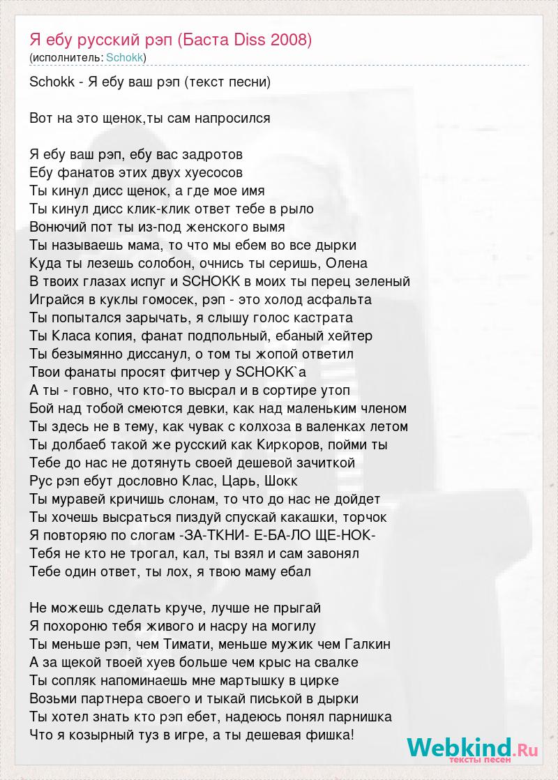 Schokk - Я ебу ваш рэп (текст песни) Вот на это щенок,ты сам напросился Я ебу ваш рэп, ебу вас задротов Ебу фанатов этих двух хуесосов Ты кинул дисс щенок, а где мое имя Ты кинул дисс клик-клик ответ тебе в рыло Вонючий пот ты из-под женского вымя Ты называешь мама, то что мы ебем во все дырки Куда ты лезешь солобон, очнись ты серишь, Олена В твоих глазах испуг и SCHOKK в моих ты перец зеленый Играйся в куклы гомосек, рэп - это холод асфальта Ты попытался зарычать, я слышу голос кастрата Ты Класа копия, фанат подпольный, ебаный хейтер Ты безымянно диссанул, о том ты жопой ответил Твои фанаты просят фитчер у SCHOKK`а А ты - говно, что кто-то высрал и в сортире утоп Бой над тобой смеются девки, как над маленьким членом Ты здесь не в тему, как чувак с колхоза в валенках летом Ты долбаеб такой же русский как Киркоров, пойми ты Тебе до нас не дотянуть своей дешевой зачиткой Рус рэп ебут дословно Клас, Царь, Шокк Ты муравей кричишь слонам, то что до нас не дойдет Ты хочешь высраться пиздуй спускай какашки, торчок Я повторяю по слогам -ЗА-ТКНИ- Е-БА-ЛО ЩЕ-НОК- Тебя не кто не трогал, кал, ты взял и сам завонял Тебе один ответ, ты лох, я твою маму ебал Не можешь сделать круче, лучше не прыгай Я похороню тебя живого и насру на могилу Ты меньше рэп, чем Тимати, меньше мужик чем Галкин А за щекой твоей хуев больше чем крыс на свалке Ты сопляк напоминаешь мне мартышку в цирке Возьми партнера своего и тыкай писькой в дырки Ты хотел знать кто рэп ебет, надеюсь понял парнишка Что я козырный туз в игре, а ты дешевая фишка!