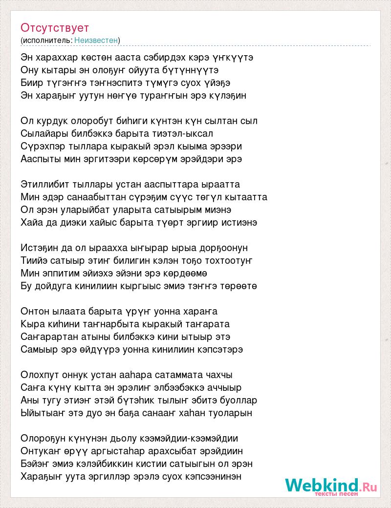 Эн хараххар көстөн ааста сэбирдэх кэрэ үҥкүүтэ Ону кытары эн олоҕуҥ ойуута бүтүннүүтэ Биир түгэҥҥэ тэҥнэспитэ түмүгэ суох үйэҕэ Эн хараҕыҥ уутун нөҥүө тураҥҥын эрэ күлэҕин Ол курдук олоробут биhиги күнтэн күн сылтан сыл Сылайары билбэккэ барыта тиэтэл-ыксал Сүрэхпэр тыллара кыракый эрэл кыыма эрээри Ааспыты мин эргитээри көрсөрүм эрэйдэри эрэ Этиллибит тыллары устан ааспыттара ыраатта Мин эдэр санаабыттан сүрэҕим сүүс төгүл кытаатта Ол эрэн уларыйбат уларыта сатыырым миэнэ Хайа да диэки хайыс барыта түөрт эргиир истиэнэ Истэҕин да ол ыраахха ыҥырар ырыа дорҕоонун Тиийэ сатыыр этиҥ билигин кэлэн тоҕо тохтоотуҥ Мин эппитим эйиэхэ эйэни эрэ көрдөөмө Бу дойдуга кинилиин кыргыыс эмиэ тэҥҥэ төрөөтө Онтон ылаата барыта үрүҥ уонна хараҥа Кыра киhини таҥнарбыта кыракый таҥарата Саҥарартан атыны билбэккэ кини ытыыр этэ Самыыр эрэ өйдүүрэ уонна кинилиин кэпсэтэрэ Олохпут оннук устан ааhара сатаммата чахчы Саҥа күнү кытта эн эрэлиҥ элбээбэккэ аччыыр Аны тугу этиэҥ этэй бүтэhик тылыҥ эбитэ буоллар Ыйытыаҥ этэ дуо эн баҕа санааҥ хаhан туоларын Олороҕун күнүнэн дьолу кээмэйдии-кээмэйдии Онтукаҥ өрүү аргыстаhар арахсыбат эрэйдиин Бэйэҥ эмиэ кэлэйбиккин кистии сатыыгын ол эрэн Хараҕыҥ уута эргиллэр эрэлэ суох кэпсээнинэн