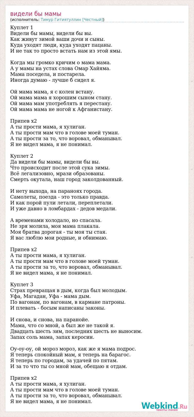 Куплет 1 Видели бы мамы, видели бы вы. Как живут зимой ваши дочи и сыны. Куда уходят люди, куда уходят пацаны. И не так то просто встать нам из этой ямы. Когда мы громко кричим о мама мама. А у мамы на устах слова Омар Хайяма. Мама поседела, и постарела. Иногда думаю - лучше б сидел я. Ой мама мама, я с колен встану. Ой мама мама я хорошим сыном стану. Ой мама мам употреблять я перестану. Ой мама мама не ногой к Афганистану. Припев х2 А ты прости мама, я хулиган. А ты прости мам что в голове моей туман. А ты прости за то, что воровал, обманывал. Я не видел мама, я не понимал. Куплет 2 Да видели бы мамы, видели бы вы. Что происходит после этой сука зимы. Всё легализовно, мрази образованы. Смерть окутала, наш город заколдованный. И нету выхода, на параноях города. Самолеты, поезда - это только правда. И как порой пули летали, переплетали. И уже давно в ломбардах - дедов медали. А временами холодало, но спасала. Не зря молила, моя мама плакала. Моя братва дорогая - ты моя ты стая. Я вас люблю мои родные, и обнимаю. Припев х2 А ты прости мама, я хулиган. А ты прости мам что в голове моей туман. А ты прости за то, что воровал, обманывал. Я не видел мама, я не понимал. Куплет 3 Страх превращая в дым, когда был молодым. Уфа, Магадан, Уфа - мама дым. По вагонам, по вагонам, в кармане патроны. И плевать - босым написаны законы. И снова, и снова, на паранойе. Мама, что со мной, а был же не такой я. Двадцать шесть зим, последних шесть не выносим. Запах соль мама, запах керосин. Оу-оу-оу, ой мороз мороз, как же я мама подрос. Я теперь спокойный мам, я теперь на барагос. Я теперь по городам, за удачей по пятам. И за то что ты со мной мам, обещаю я отдам. Припев x2 А ты прости мама, я хулиган. А ты прости мам что в голове моей туман. А ты прости за то, что воровал, обманывал. Я не видел мама, я не понимал.