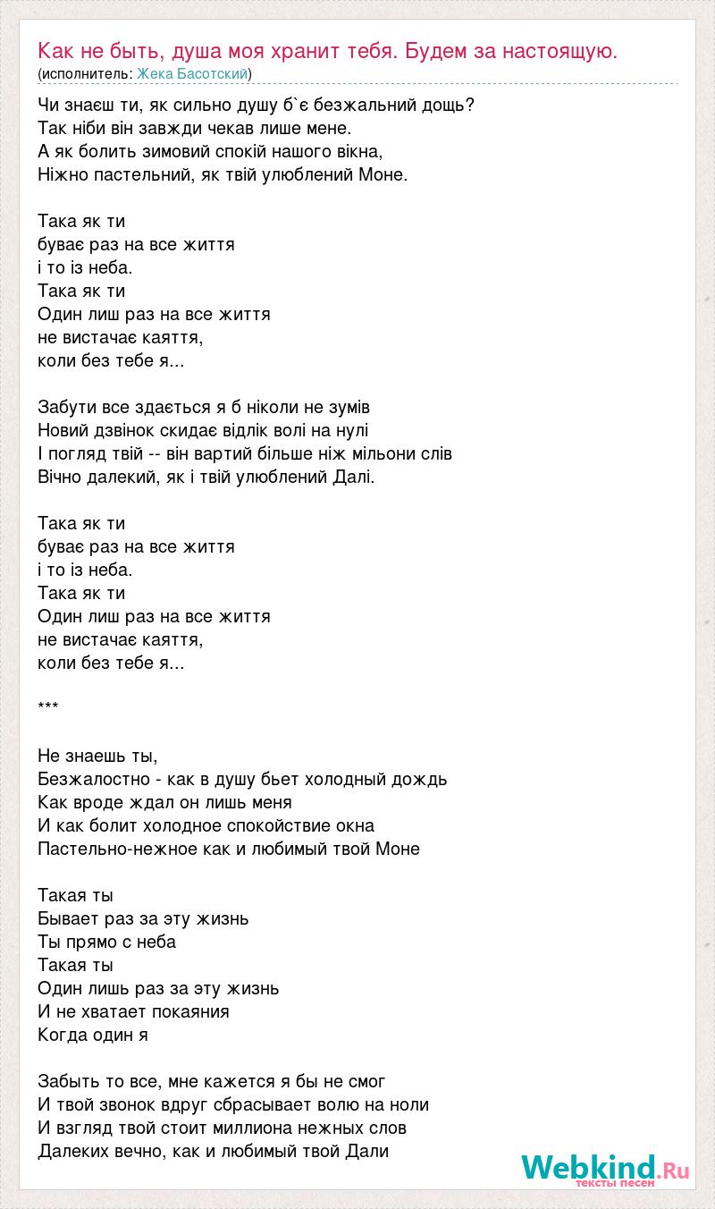 Чи знаєш ти, як сильно душу б`є безжальний дощь? Так ніби він завжди чекав лише мене. А як болить зимовий спокій нашого вікна, Ніжно пастельний, як твій улюблений Моне. Така як ти буває раз на все життя і то із неба. Така як ти Один лиш раз на все життя не вистачає каяття, коли без тебе я... Забути все здається я б ніколи не зумів Новий дзвінок скидає відлік волі на нулі І погляд твій -- він вартий більше ніж мільони слів Вічно далекий, як і твій улюблений Далі. Така як ти буває раз на все життя і то із неба. Така як ти Один лиш раз на все життя не вистачає каяття, коли без тебе я... *** Не знаешь ты, Безжалостно - как в душу бьет холодный дождь Как вроде ждал он лишь меня И как болит холодное спокойствие окна Пастельно-нежное как и любимый твой Моне Такая ты Бывает раз за эту жизнь Ты прямо с неба Такая ты Один лишь раз за эту жизнь И не хватает покаяния Когда один я Забыть то все, мне кажется я бы не смог И твой звонок вдруг сбрасывает волю на ноли И взгляд твой стоит миллиона нежных слов Далеких вечно, как и любимый твой Дали