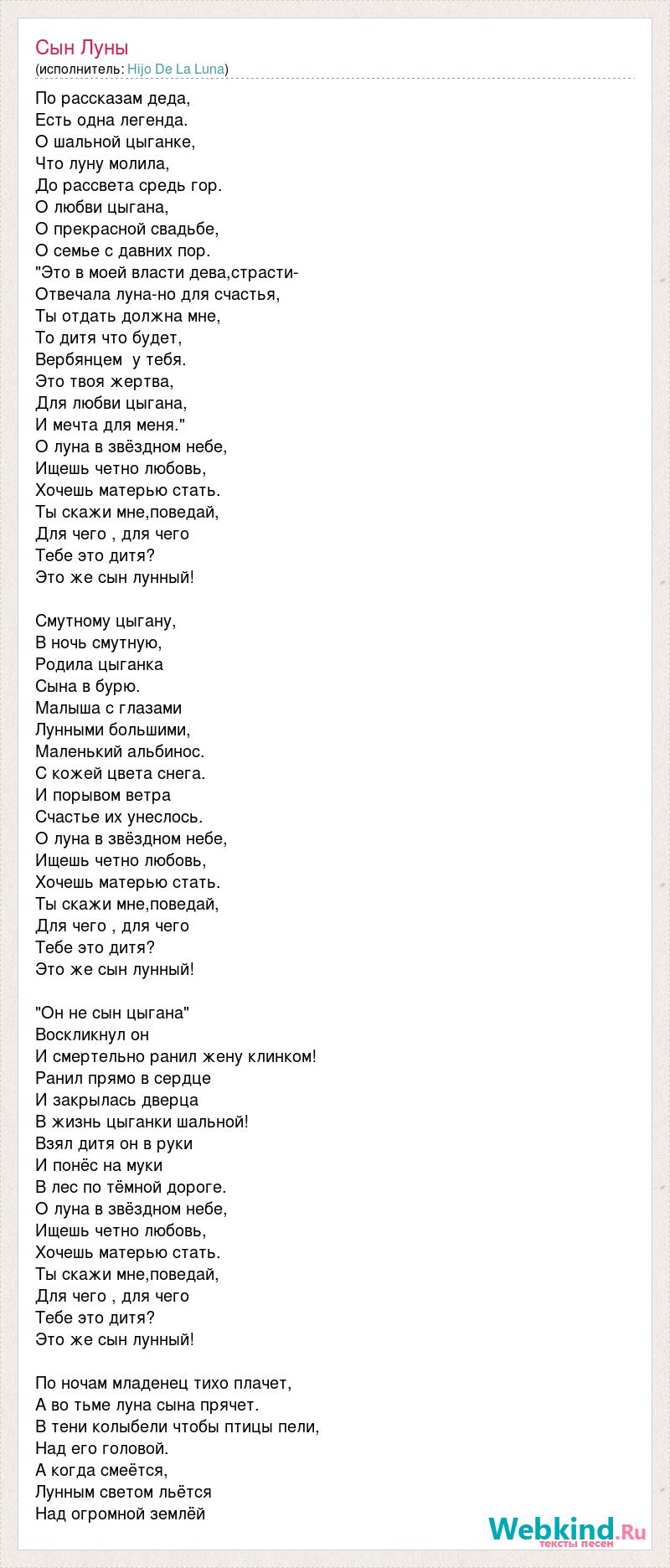 По рассказам деда, Есть одна легенда. О шальной цыганке, Что луну молила, До рассвета средь гор. О любви цыгана, О прекрасной свадьбе, О семье с давних пор. "Это в моей власти дева,страсти- Отвечала луна-но для счастья, Ты отдать должна мне, То дитя что будет, Вербянцем у тебя. Это твоя жертва, Для любви цыгана, И мечта для меня." О луна в звёздном небе, Ищешь четно любовь, Хочешь матерью стать. Ты скажи мне,поведай, Для чего , для чего Тебе это дитя? Это же сын лунный! Смутному цыгану, В ночь смутную, Родила цыганка Сына в бурю. Малыша с глазами Лунными большими, Маленький альбинос. С кожей цвета снега. И порывом ветра Счастье их унеслось. О луна в звёздном небе, Ищешь четно любовь, Хочешь матерью стать. Ты скажи мне,поведай, Для чего , для чего Тебе это дитя? Это же сын лунный! "Он не сын цыгана" Воскликнул он И смертельно ранил жену клинком! Ранил прямо в сердце И закрылась дверца В жизнь цыганки шальной! Взял дитя он в руки И понёс на муки В лес по тёмной дороге. О луна в звёздном небе, Ищешь четно любовь, Хочешь матерью стать. Ты скажи мне,поведай, Для чего , для чего Тебе это дитя? Это же сын лунный! По ночам младенец тихо плачет, А во тьме луна сына прячет. В тени колыбели чтобы птицы пели, Над его головой. А когда смеётся, Лунным светом льётся Над огромной землёй