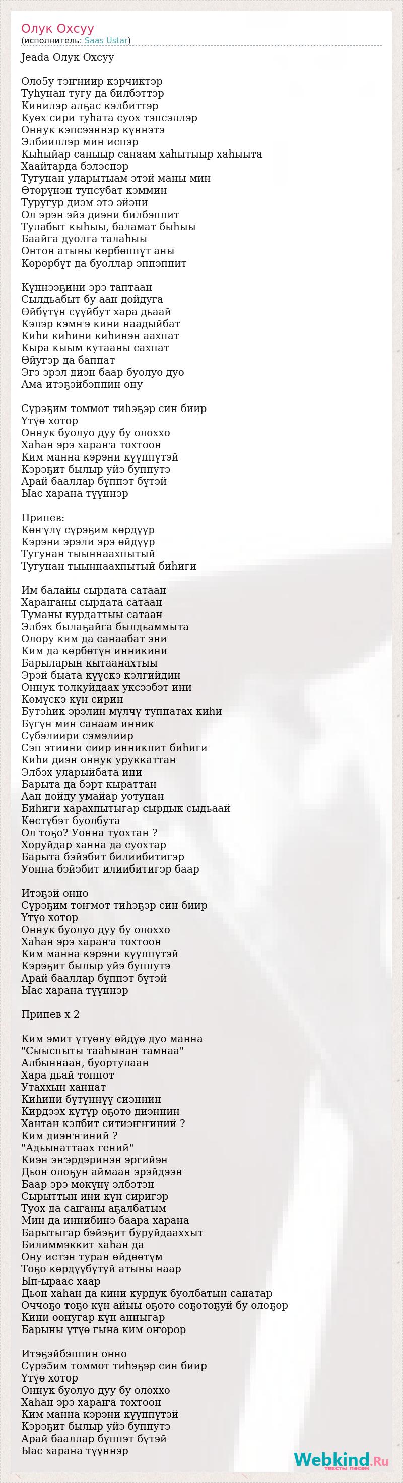 Jeada Олук Охсуу Оло5у тэҥниир кэрчиктэр Туһунан тугу да билбэттэр Кинилэр алҕас кэлбиттэр Кyөх сири туһата суох тэпсэллэр Оннук кэпсээннэр күннэтэ Элбииллэр мин испэр Кыһыйар саныыр санаам хаһытыыр хаһыыта Хаайтарда бэлэспэр Тугунан уларытыам этэй маны мин Өтөрүнэн тупсубат кэммин Туругур диэм этэ эйэни Ол эрэн эйэ диэни билбэппит Тулабыт кыһыы, баламат быһыы Баайга дуолга талаһыы Онтон атыны көрбөппүт аны Көрөрбүт да буоллар эппэппит Күннээҕини эрэ таптаан Сылдьабыт бу аан дойдуга Өйбүтүн сүүйбут хара дьаай Кэлэр кэмҥэ кини наадыйбат Киһи киһини киһинэн аахпат Кыра кыым кутааны сахпат Өйугэр да баппат Эгэ эрэл диэн баар буолуо дуо Ама итэҕэйбэппин ону Сүрэҕим томмот тиһэҕэр син биир Үтүө хотор Оннук буолуо дуу бу олоххо Хаһан эрэ хараҥа тохтоон Ким манна кэрэни күүппүтэй Кэрэҕит былыр уйэ буппутэ Арай бааллар бүппэт бүтэй Ыас харана түүннэр Припев: Көҥүлү сүрэҕим көрдүүр Кэрэни эрэли эрэ өйдүүр Тугунан тыыннаахпытый Тугунан тыыннаахпытый биһиги Им балайы сырдата сатаан Хараҥаны сырдата сатаан Туманы курдаттыы сатаан Элбэх былаҕайга былдьаммыта Олору ким да санаабат эни Ким да көрбөтүн инникини Барыларын кытаанахтыы Эрэй быата күүскэ кэлгийдин Оннук толкуйдаах уксээбэт ини Көмүскэ күн сирин Бутэһик эрэлин мүлчү туппатах киһи Бүгүн мин санаам инник Сүбэлиири сэмэлиир Сэп этиини сиир инникпит биһиги Киһи диэн оннук уруккаттан Элбэх уларыйбата ини Барыта да бэрт кыраттан Аан дойду умайар уотунан Биһиги харахпытыгар сырдык сыдьаай Көстүбэт буолбута Ол тоҕо? Уонна туохтан ? Хоруйдар ханна да суохтар Барыта бэйэбит билиибитигэр Уонна бэйэбит илиибитигэр баар Итэҕэй онно Сүрэҕим тоҥмот тиһэҕэр син биир Үтүө хотор Оннук буолуо дуу бу олоххо Хаһан эрэ хараҥа тохтоон Ким манна кэрэни күүппүтэй Кэрэҕит былыр уйэ буппутэ Арай бааллар бүппэт бүтэй Ыас харана түүннэр Припев х 2 Ким эмит үтүөну өйдүө дуо манна "Сыыспыты тааһынан тамнаа" Албыннаан, буортулаан Хара дьай топпот Утаххын ханнат Киһини бүтүннүү сиэннин Кирдээх күтүр оҕото диэннин Хантан кэлбит ситиэҥҥиний ? Ким диэҥҥиний ? "Адьынаттаах гений" Киэн эҥэрдэринэн эргийэн Дьон олоҕун аймаан эрэйдээн Баар эрэ мөкүнү элбэтэн Сырыттын ини күн сиригэр Туох да саҥаны аҕалбатым Мин да иннибинэ баара харана Барытыгар бэйэҕит буруйдааххыт Билиммэккит хаһан да Ону истэн туран өйдөөтүм Тоҕо көрдүүбүтүй атыны наар Ып-ыраас хаар Дьон хаһан да кини курдук буолбатын санатар Оччоҕо тоҕо күн айыы оҕото соҕотоҕуй бу олоҕор Кини оонугар күн анныгар Барыны үтүө гына ким оҥорор Итэҕэйбэппин онно Сүрэ5им томмот тиһэҕэр син биир Үтүө хотор Оннук буолуо дуу бу олоххо Хаһан эрэ хараҥа тохтоон Ким манна кэрэни күүппүтэй Кэрэҕит былыр уйэ буппутэ Арай бааллар бүппэт бүтэй Ыас харана түүннэр