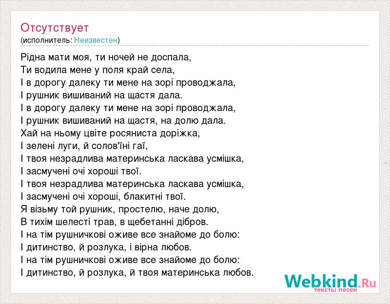 Рідна мати моя, ти ночей не доспала, Ти водила мене у поля край села, І в дорогу далеку ти мене на зорі проводжала, І рушник вишиваний на щастя дала. І в дорогу далеку ти мене на зорі проводжала, І рушник вишиваний на щастя, на долю дала. Хай на ньому цвіте росяниста доріжка, І зелені луги, й солов'їні гаї, І твоя незрадлива материнська ласкава усмішка, І засмучені очі хороші твої. І твоя незрадлива материнська ласкава усмішка, І засмучені очі хороші, блакитні твої. Я візьму той рушник, простелю, наче долю, В тихім шелесті трав, в щебетанні дібров. І на тім рушничкові оживе все знайоме до болю: І дитинство, й розлука, і вірна любов. І на тім рушничкові оживе все знайоме до болю: І дитинство, й розлука, й твоя материнська любов.