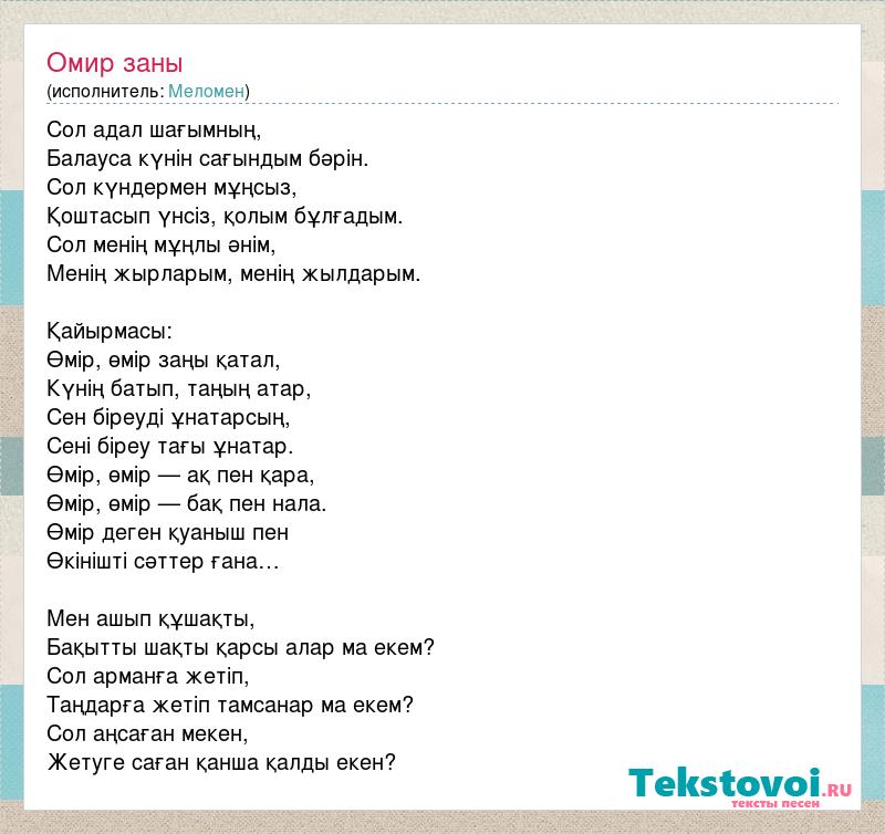 Сол адал шағымның, Балауса күнін сағындым бәрін. Сол күндермен мұңсыз, Қоштасып үнсіз, қолым бұлғадым. Сол менің мұңлы әнім, Менің жырларым, менің жылдарым. Қайырмасы: Өмір, өмір заңы қатал, Күнің батып, таңың атар, Сен біреуді ұнатарсың, Сені біреу тағы ұнатар. Өмір, өмір — ақ пен қара, Өмір, өмір — бақ пен нала. Өмір деген қуаныш пен Өкінішті сәттер ғана… Мен ашып құшақты, Бақытты шақты қарсы алар ма екем? Сол арманға жетіп, Таңдарға жетіп тамсанар ма екем? Сол аңсаған мекен, Жетуге саған қанша қалды екен?