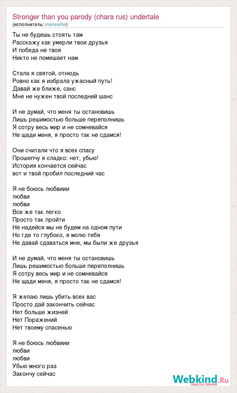 А как ты думаешь, о чем песня "Stronger than you parody (chara rus) undertale" ?
