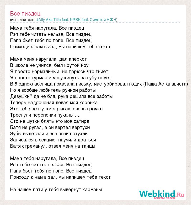 Мама тебя наругала, Все пиздец Рэп тебе читать нельзя, Все пиздец Папа бьет тебя по попе, Все пиздец Приходи к нам в зал, мы напишем тебе текст Мама меня наругала, дал аперкот В школе не учился, был крутой йоу Я просто нормальный, не парюсь что гниет Я просто гурман и могу кинуть за губу помет В 5 одноклассница показала письку, мастурбировал годик (Паша Астанависта) Но я вообще любитель ручной работы Девушки? да не бля, рука решила все заботы Теперь надроченая левая моя коронка Это тебе не шутки я рыгаю очень громко Треснули перепонки пуканы .... Это не шутки блять это моя сатира Батя не ругал, а он вертел вертухи Зубы вылетали и все огни потухли Записался в секцию, научили драться Батя стреманул, отвел меня на танцы Мама тебя наругала, Все пиздец Рэп тебе читать нельзя, Все пиздец Папа бьет тебя по попе, Все пиздец Приходи к нам в зал, мы напишем тебе текст На нашем пати у тебя вывернут карманы